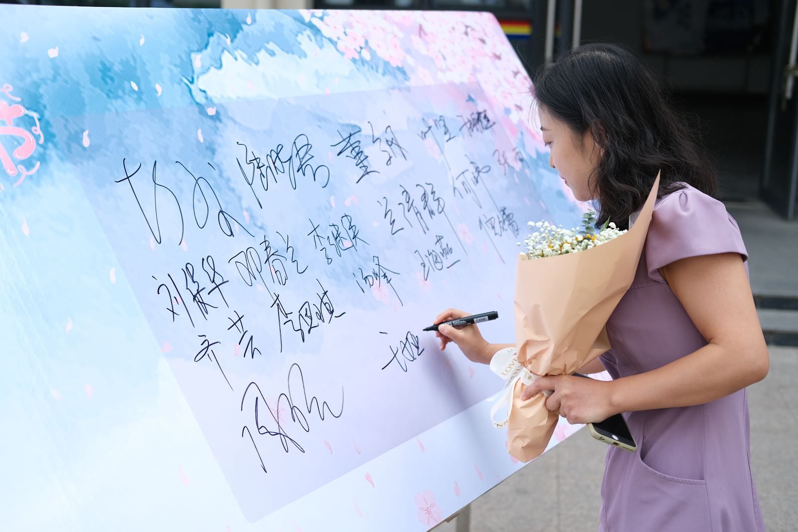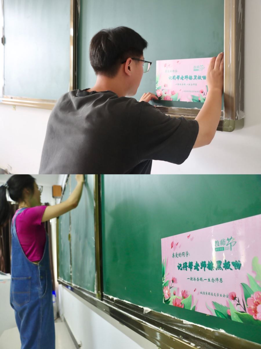 温暖人心的祝福语透过一张张卡片,那是同学们对老师们的祝福,对老师们情谊的诉说,一笔一画中厚植爱国情怀,涵养高尚品德。老师们也在祝福墙上留下签名、记录下最美的身影,师生同频共振,相得益彰。