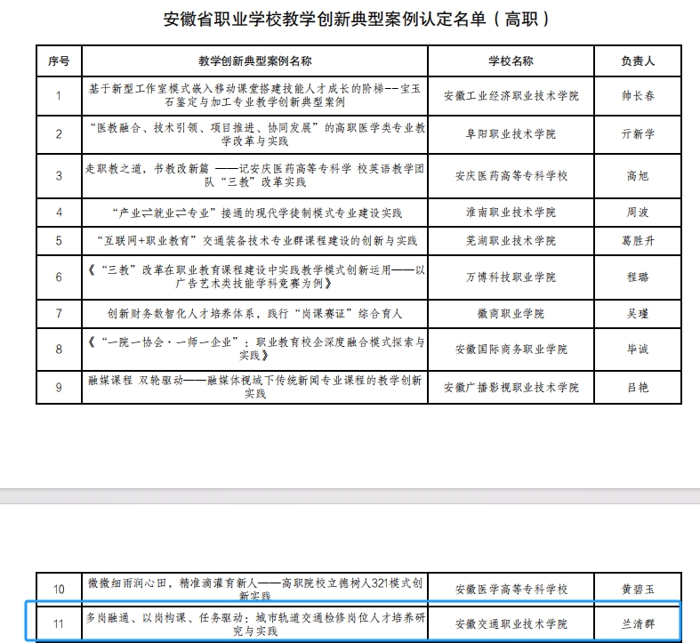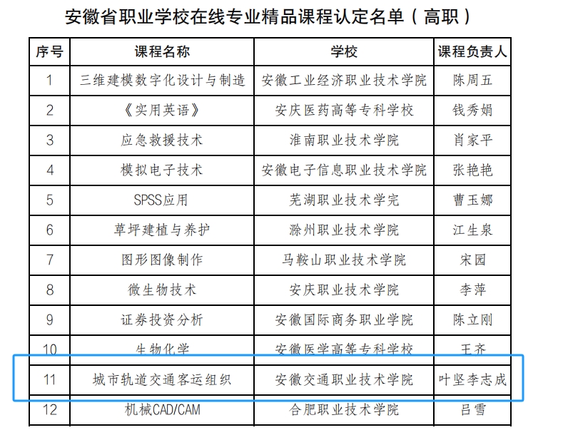 近日,安徽省教育厅印发《安徽省教育厅关于公布安徽省首批“六百工程”项目名单的通知》,我系副主任(主持工作)兰清群主持的“多岗融通、以岗构课、任务驱动:城市轨道交通检修岗位人才培养研究与实践”获批为安徽省职业学校教学创新典型案例;城信系副主任李志成、教师叶坚主持的“城市轨道交通客运组织”获批为安徽省职业学校在线专业精品课程;李志成荣获“江淮职教名师”称号。