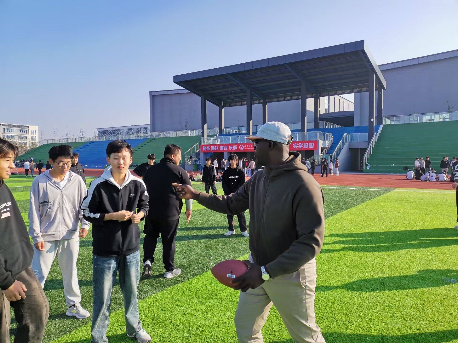 本次活动由城信系2024级计算机应用(中外合作专业)3班和4班的英语外教Mohamadou Djida Ismaël携手国际班辅导员张伟涵精心策划,中外合作班级全体学生参加。活动现场,同学在外教老师Mohamadou Djida Ismaël的指导下,将英语学习与橄榄球运动巧妙结合,体验了精彩的户外课堂。