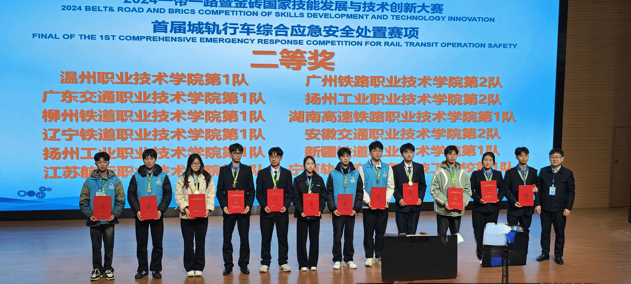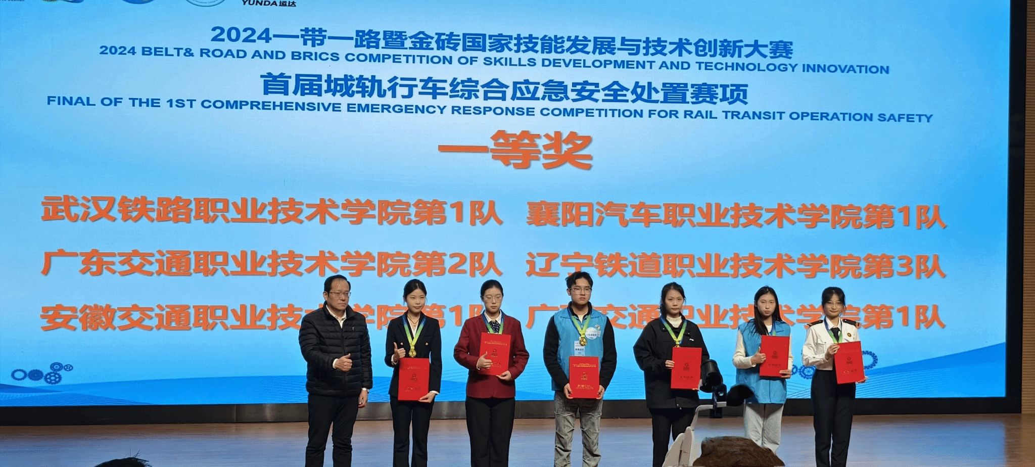 12月6日至8日,2024“一带一路”暨金砖国家技能发展与技术创新大赛首届城轨行车综合应急安全处置赛项全国总决赛在武汉铁路职业技术学院顺利举行。经过激烈的角逐,我院城信系朱永霞、陆中石两位老师指导的刘冰然、王欣玥、宋常坤、蒋子豪团队和李艳艳、苗伟两位老师指导的杨倩雨、吴雪、宋蔓菲、杨国豪团队和分别获得一金(一等奖)一银(二等奖),学院获“最佳组织奖”。