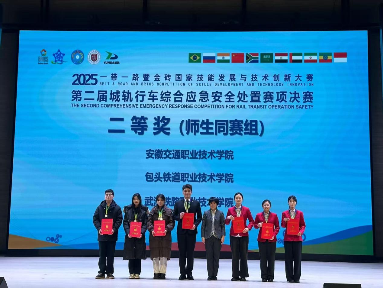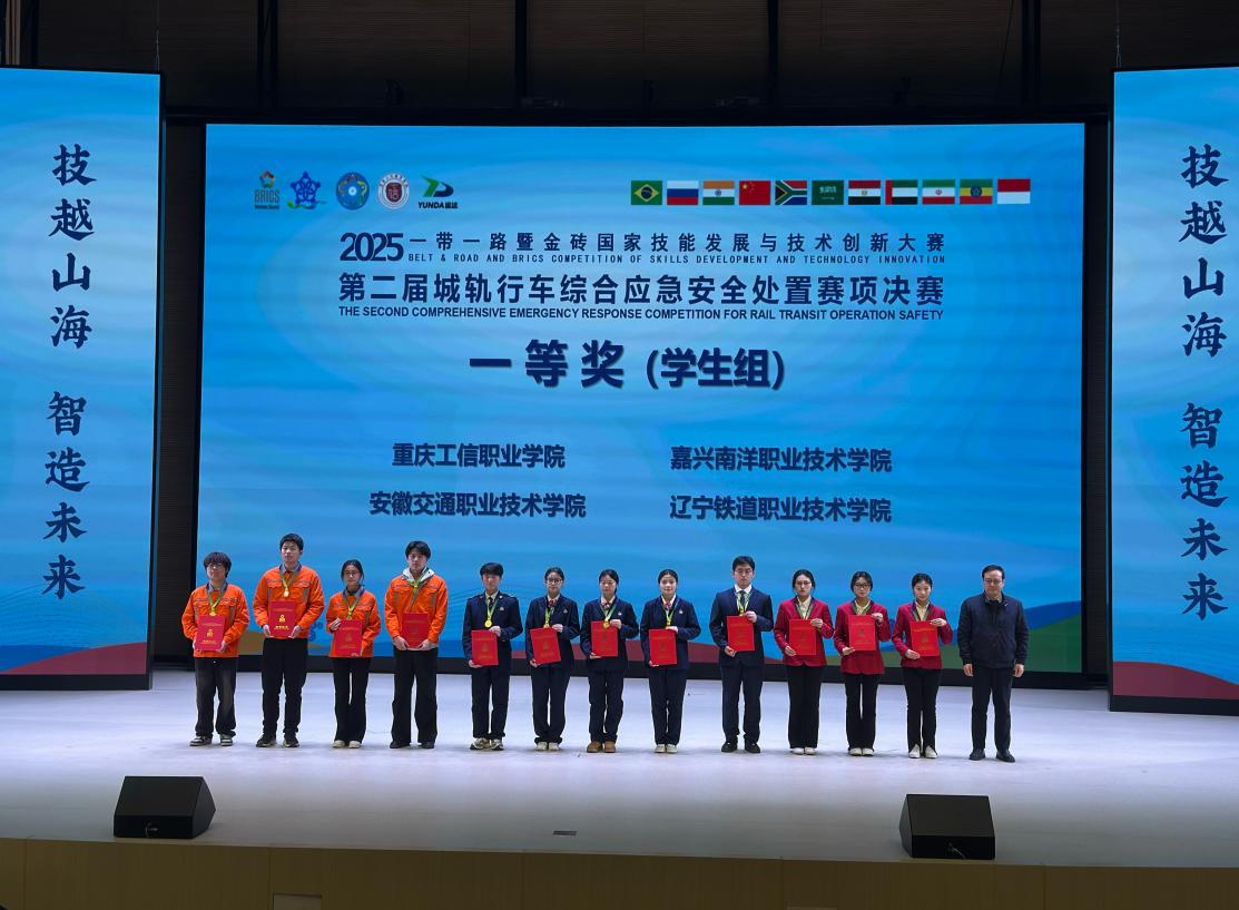 12月24日至27日,2025“一带一路”暨金砖国家技能发展与技术创新大赛第二届城轨行车综合应急安全处置赛项决赛在重庆工信职业学院圆满举办。赛场竞逐,锋芒尽显,轨道交通学院朱永霞、苗伟老师指导的学生组(24运营1班李若涵、刘紫悦、赵沁雅,24车辆1班季鸿伟)以及李艳艳老师指导的师生同赛组(王佳漫,24运营2班谈婧璇、周璇,24车辆1班杨朋宇),凭借扎实的专业功底与出色的临场应变能力,分别斩获赛事一等奖与二等奖,学校荣获“最佳组织奖”,在全国舞台上彰显了办学育人的硬核实力。