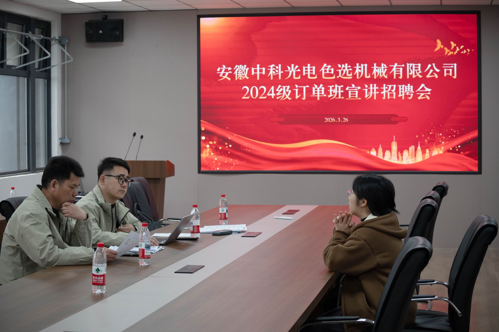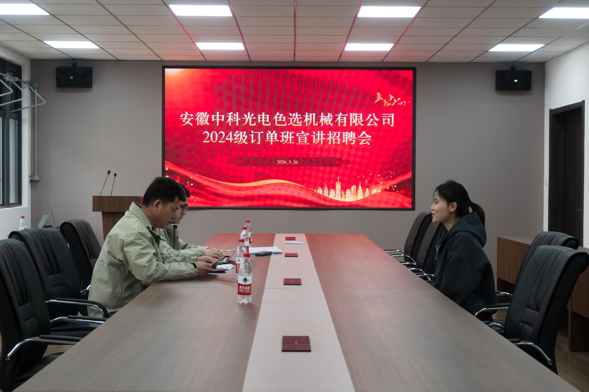 宣讲环节,企业代表详细介绍了公司发展历程、核心业务与技术优势,重点讲解光电分选、智能检测、高端装备研发等领域的技术优势与发展前景,帮助同学们清晰了解企业实力与岗位方向。随后的面试环节,学生们沉稳应对,充分展示专业知识与实训成果;企业面试官严谨细致,一对一深度交流,精准筛选适配人才,为订单班定向培养与定岗实习奠定坚实基础。