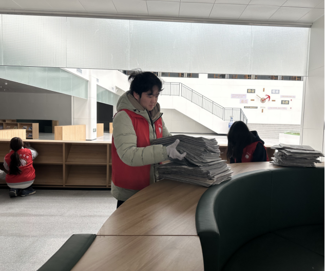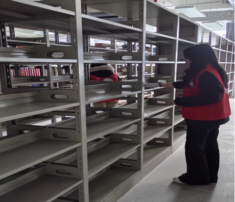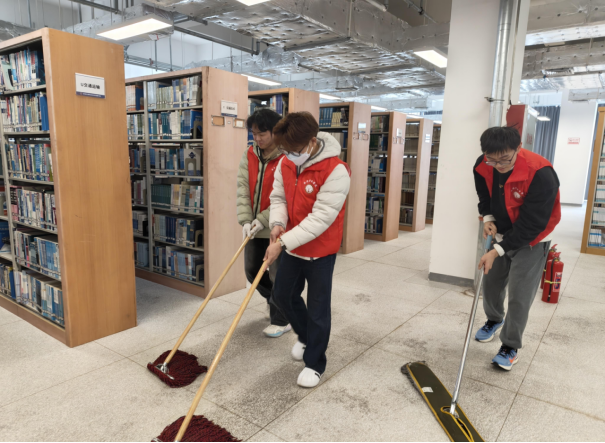 到达图书馆后,志愿者们陆续就位。第一组志愿者们以饱满的热情投入到工作中,负责一楼大厅期刊更新、书籍整理、书架擦拭与公共区域卫生清扫,同时承担安全通道隐患排查、消防设施检查、通道保洁工作,兼顾服务便捷与校园安全,为师生营造整洁有序、安全畅通的阅览环境。