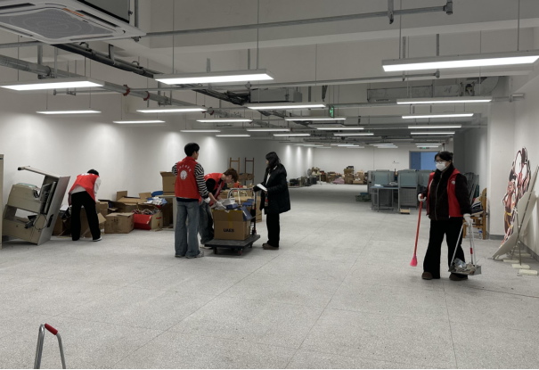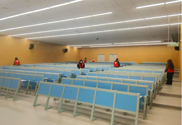 第四组志愿者们负责报告厅与仓库两大区域,全面清扫报告厅座椅、地面与角落;对仓库物资分类清点、规整归位,同时做好清扫工作,为图书馆活动开展与日常运营提供坚实保障。