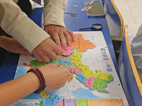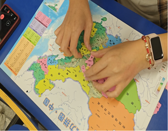 比赛现场,各参赛队伍围绕中国地图拼图展开激烈角逐。选手们手持拼图碎片,在熟悉的省份轮廓与地理标识中快速定位,从“雄鸡”版图的东北一隅到南海诸岛,每一块碎片的精准拼接,都凝聚着对祖国疆域的清晰认知。过程中,有的队伍分工协作、默契配合,快速梳理碎片特征;有的队伍沉着冷静,在细节处反复比对,确保每一寸“国土”都准确归位。当最后一块代表宝岛台湾的拼图嵌入版图,现场响起阵阵掌声,选手们看着完整的中国地图,脸上洋溢着自豪与坚定。
