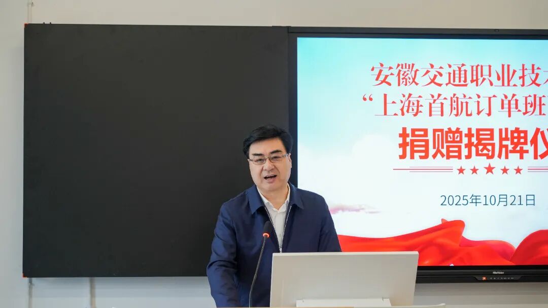 10月21日上午,安徽交通职业技术学院“上海首航订单班”教室捐赠揭牌仪式在云帆楼311顺利举行。上海市虹口区人大代表、上海首航船务有限公司董事长韩朝林、校党委副书记、校长孙晓雷出席仪式,企业代表、航运工程学院领导师生代表共计六十余人参加仪式。仪式由校党委委员、副校长梁洪波主持。
