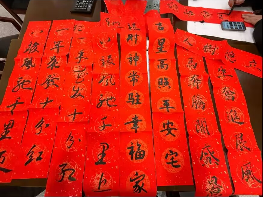 一幅幅笔力遒劲的春联、一个个喜庆饱满的“福”字渐次呈现。“书山探秘躬行早,学海泛舟志气高”“乘风破浪航运志,纬地经天报国情”“桃李迎春芳满院,芝兰竞秀喜盈门”……工整对仗的文字承载着真挚的新春祝福,刚健洒脱的笔触展现着传统文化的深厚魅力。
