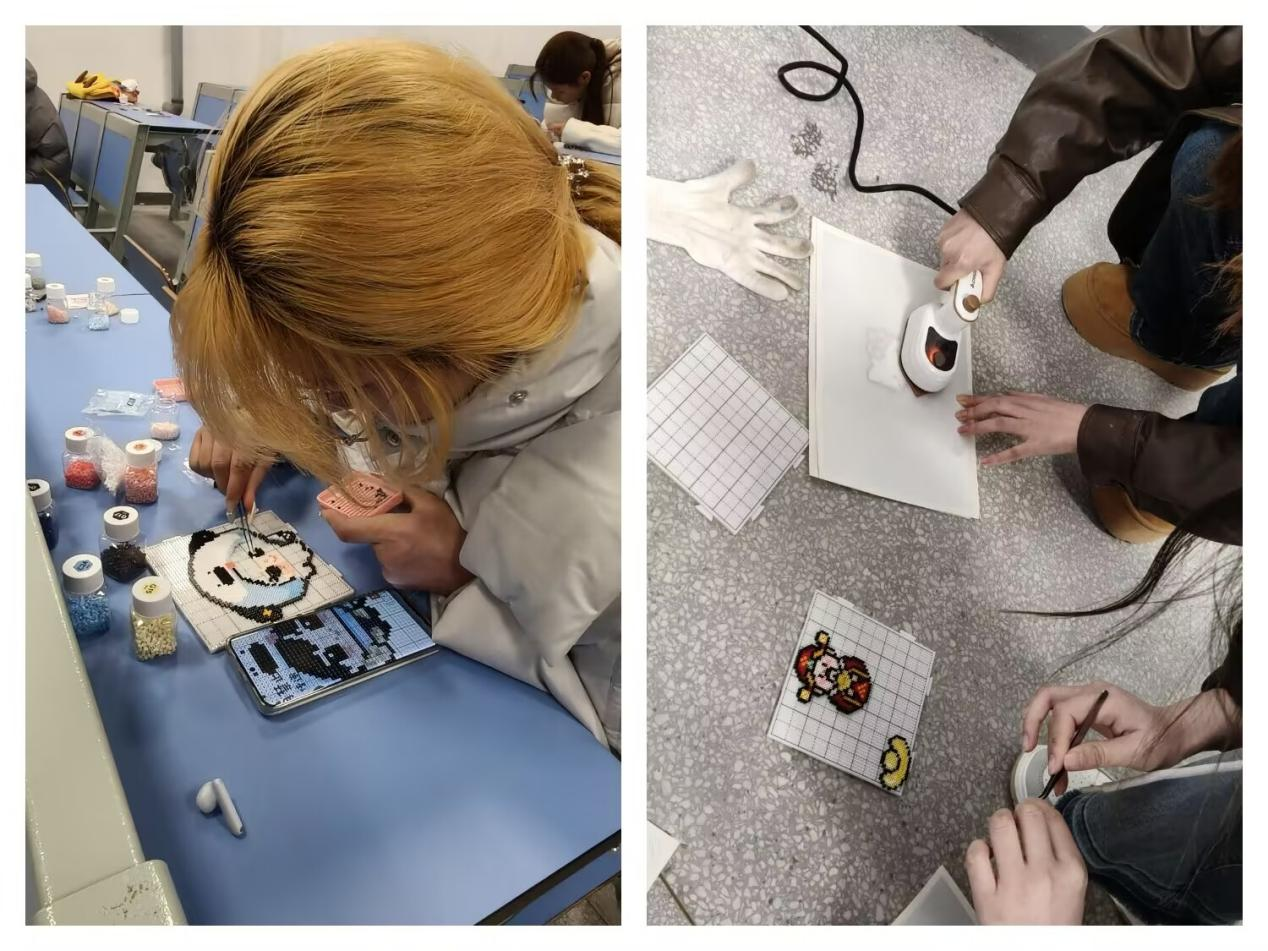 创作过程中,大家围坐在一起,互相交流灵感、分享技巧,在专注与协作中放松身心、释放压力。有人对照图案细致拼搭,有人随性发挥自由创作。每一颗豆粒的摆放、每一次扭棒的缠绕,都倾注着对生活的热爱与对自我的表达。当零散的拼豆在熨烫机的温度下凝结成完整的作品,当柔软的扭扭棒被塑造成精美的装饰,女生们手捧自己的劳动成果,脸上洋溢着满满的成就感与幸福感。