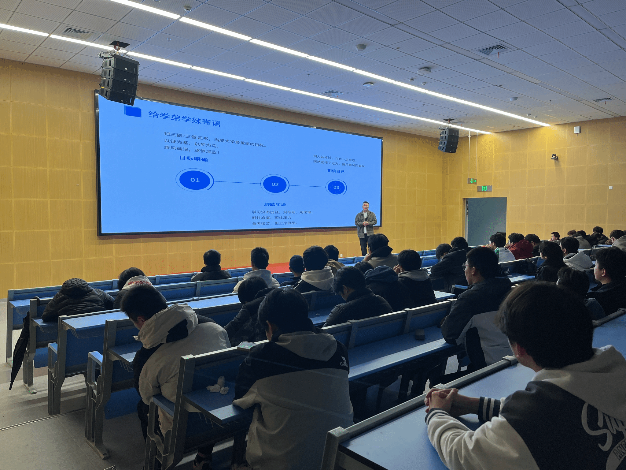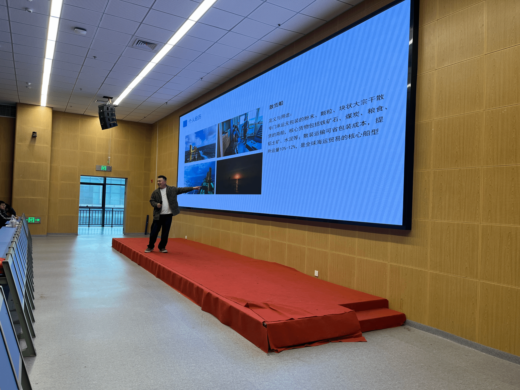 在个人经历分享环节,王迟回忆了自己从入学迷茫到坚定航海梦的过程,讲述了备考期间早起背书、深夜刷题的心路历程,鼓励学弟学妹们“耐住寂寞,顶住压力”,将证书视为大学期间最重要的目标。他还结合上船后的工作体会,强调理论与实践相结合,提醒同学们珍惜在校学习时光,打好专业基础。