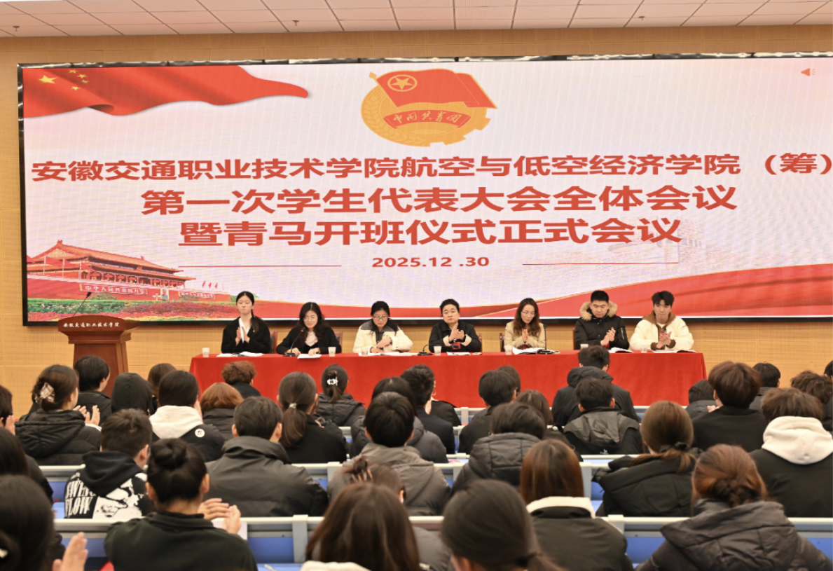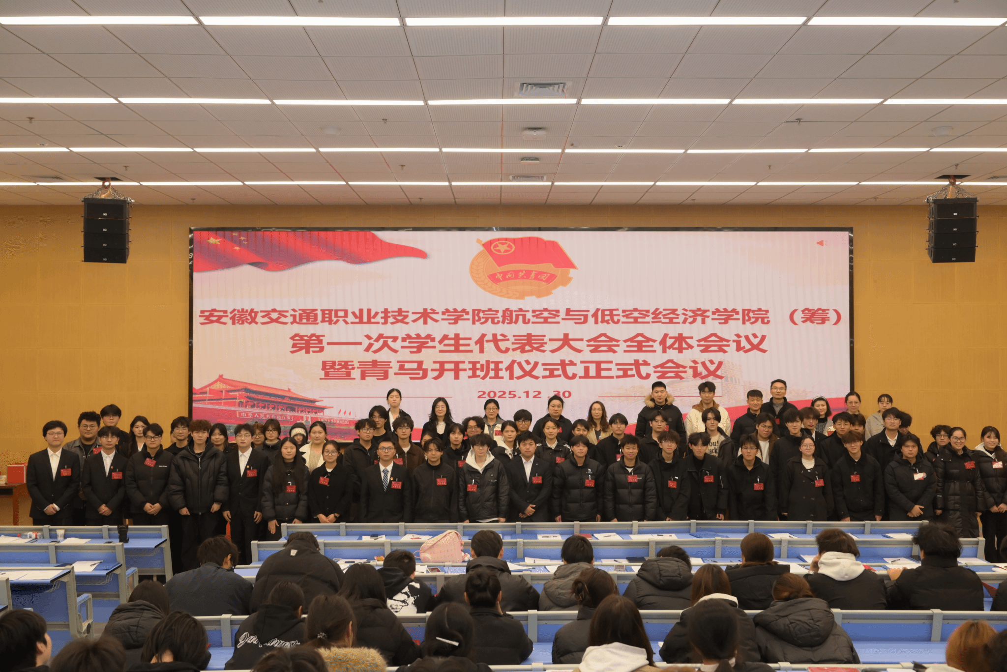 2025年12月30日下午,安徽交通职业技术学院航空与低空经济学院(筹)第一次学生代表大会暨“青马工程”开班仪式在庄严的国歌声中开幕。大会以“弘扬二十大精神,争做新时代青年”为主题,来自全院各年级、专业的55名学生代表参会。学院党支部相关领导出席开幕式。