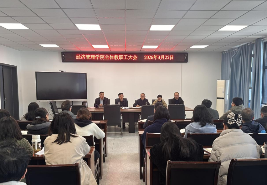 3月25日,经济管理学院在文华楼会议室召开全体教职工大会,集中学习上级精神、部署近期重点工作。校党委副书记、校长孙晓雷莅临指导,校办公室主任张娟列席,学院党总支书记夏保军主持会议,全体教职工参会。