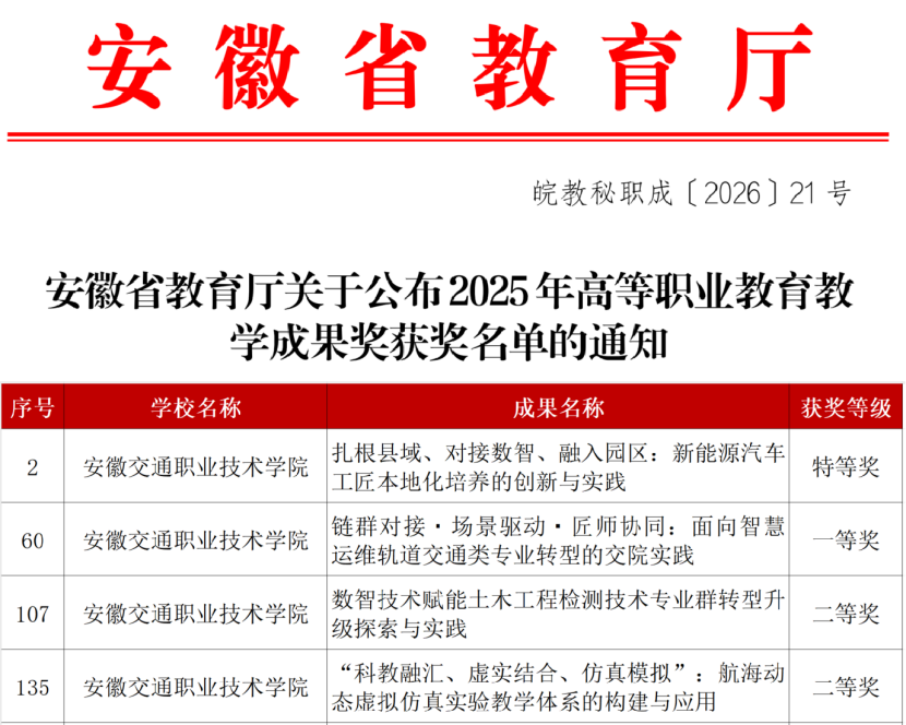 近日,安徽省教育厅正式发布《安徽省教育厅关于公布2025年高等职业教育教学成果奖获奖名单的通知》(皖教秘职成〔2026〕21号),我校喜获特等奖1项、一等奖1项、二等奖2项,共4项成果上榜。有力地展现了我校在教育教学改革、专业建设及人才培养方面深耕不辍的深厚底蕴与锐意进取的创新活力。