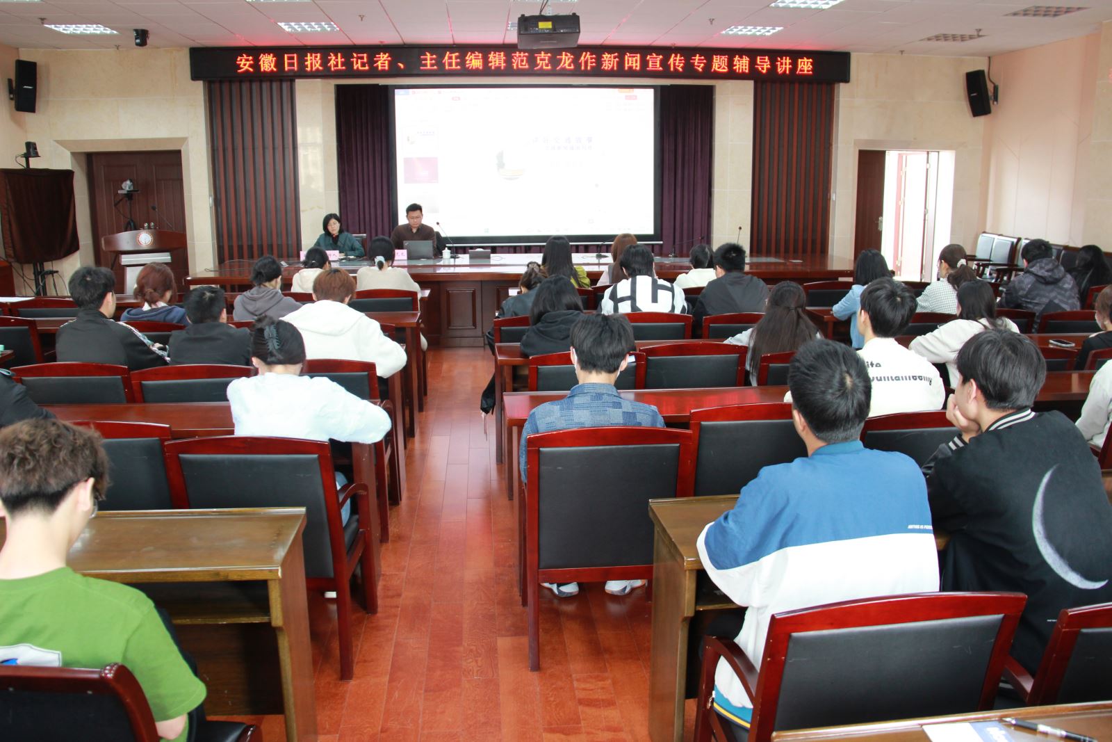 为深入推进学习贯彻习近平新时代中国特色社会主义思想主题教育,切实提升学院新闻宣传工作质量和水平,4月26日下午,学院特邀安徽日报社记者、高级编辑范克龙为师生开展新闻宣传专题培训讲座。讲座由组织人事处副处长肖虹主持。