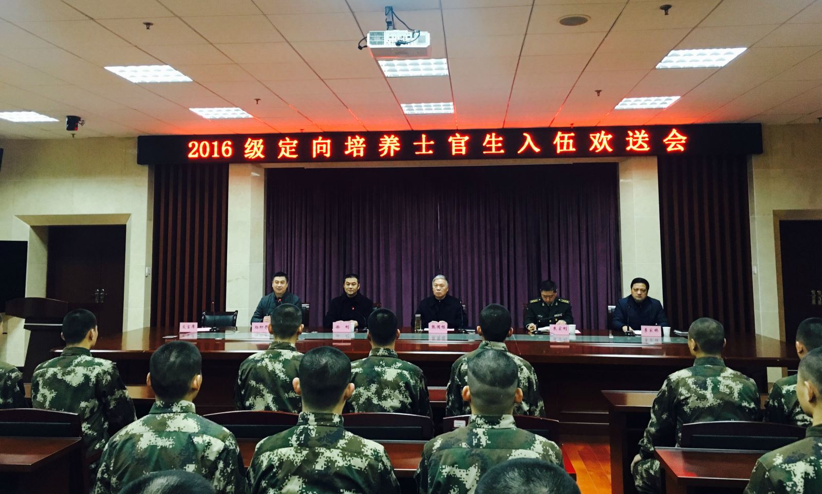 12月26日下午,学院举行2016级定向培养士官生入伍欢送会。包河区人武部部长朱宏刚受邀参加。院长张国栋,学生处、汽车与机械工程系相关负责人及辅导员一起欢送士官生入伍。