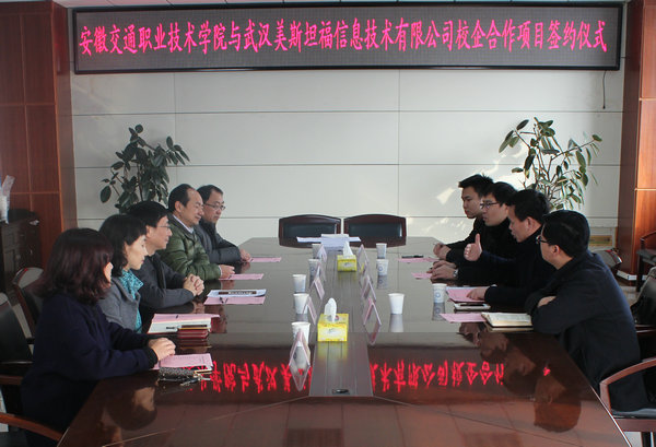 王丰胜代表学院对胡新海一行的到来表示热烈欢迎,他说,武汉美斯坦福信息技术有限公司凭借先进的职业教育理念、教学模式、教学手段、教学方法、教育服务、就业优势,致力于高等院校计算机学科创新与发展,致力于与各大专院校校企共建,学院非常期待和美斯坦福的合作,希望通过与美斯坦福的校企共建项目,在校企资源共享、师资队伍建设、实训基地建设、社会服务能力提升等方面取得丰硕成果,使我院成为安徽高职院校校企合作的领头羊。王丰胜表示,在今后的合作中,双方加强沟通,建立良好、畅通的工作平台,信息交换,相互磋商,及时地解决教育过程中出现的难题,面对合作中的新情况和新问题,相互理解,相互信任,共同克服和解决出现的困难和问题。