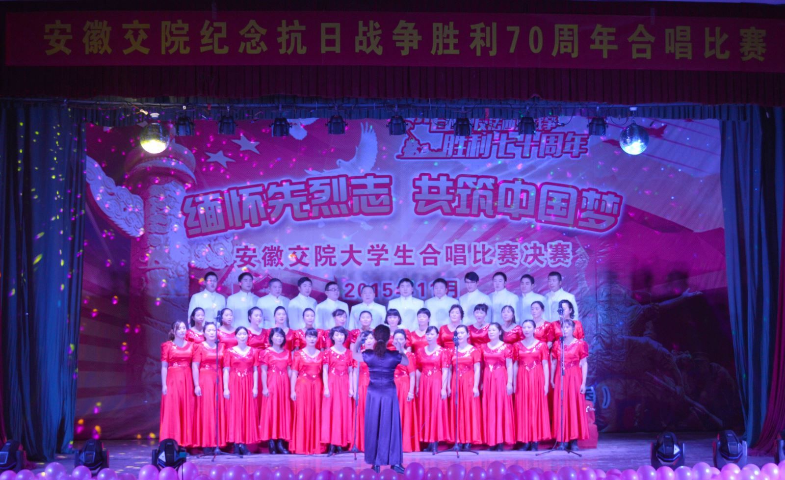 11月25日下午3:00,“缅怀先烈志,共筑中国梦”纪念抗日战争胜利70周年大合唱比赛在院南区大礼堂隆重举行院党委副书记(主持党委工作)孙顺利、党委副书记、纪委书记陈明、副院长王丰胜、李亮等领导亲临比赛现场。比赛特邀中国音乐家协会会员、安徽省合唱协会副主席、安徽艺术职业技术学院音乐教授吴小舟,安徽广播电视台音乐广播策划部主任锐红,合肥师范学院音乐系龙飞担任评委。