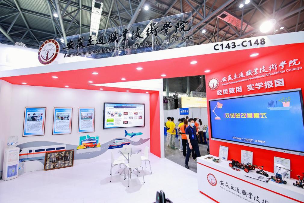 轨道交通、航空、航海、道路建设……作为安徽省唯一一所交通运输类高职院校,安徽交通职业技术学院展台上集纳了多种交通元素,展现了学校完善的“车、轨、邮、海、陆、空”现代综合交通专业人才培养体系。