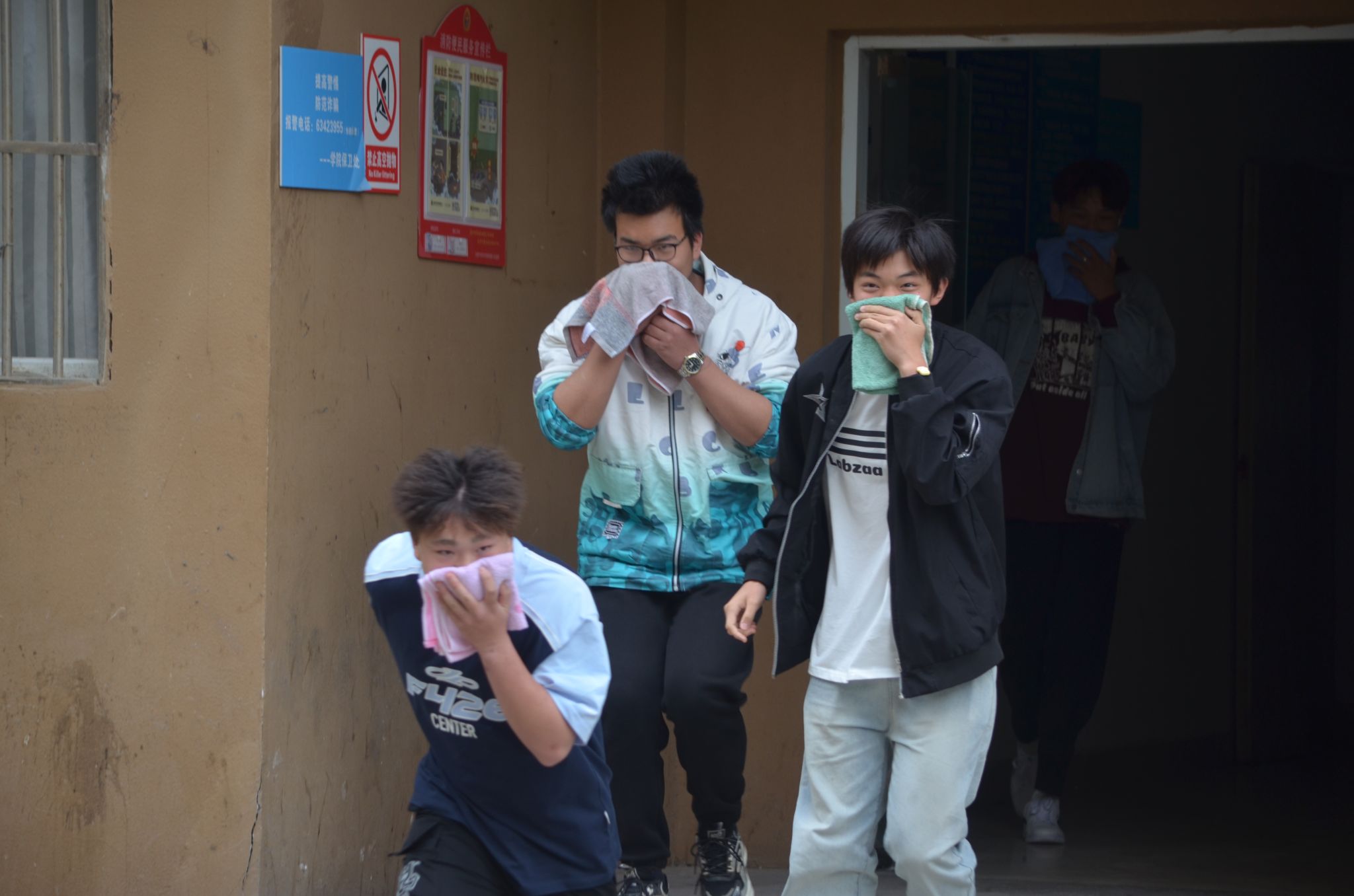 随着消防演习烟雾拉起,顷刻间宿舍楼内浓烟滚滚,演练正式开始!全体师生迅速启动应急预案,学生宿舍值班人员、安保巡逻队员第一时间到达各楼层疏散点,引导学生按照指定的疏散路线,冷静、快速撤离。同学们纷纷低姿弯腰,用湿毛巾、手帕等捂住口鼻,从宿舍有序地按逃生路线分方向、分楼层有条不紊地沿指定疏散路线撤离到操场安全区域,做到了遇“火”冷静、正确自救、快速逃生。消防部门“接警”后,第一时间赶到现场,展开“火情”扑救,整个应急疏散全过程井然有序,达到了预期效果。