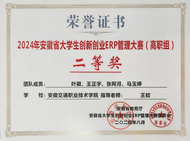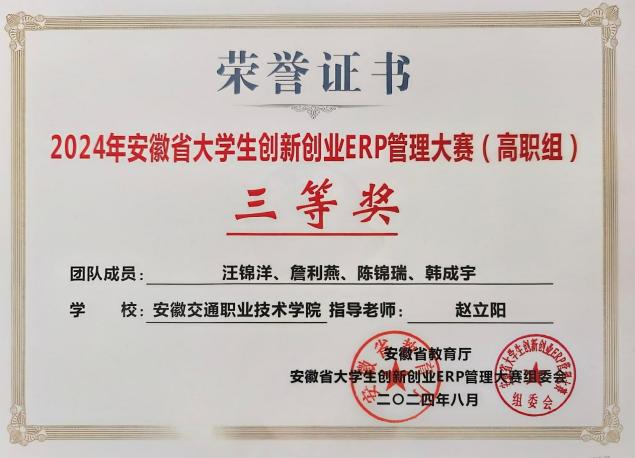 近日,由安徽省教育厅主办的2024年安徽省大学生创新创业ERP管理大赛圆满落下帷幕。经过激烈角逐,我院管理系王蛟、赵立阳老师指导的两支参赛队在高职组分别荣获二等奖、三等奖。在比赛过程中,参赛团队展现了出色的团队协作能力和创新思维,成功应对了各项挑战,最终取得了优异成绩。