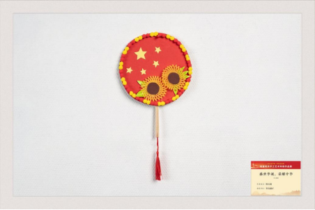 杨玉菡的作品《盛世华诞 荣耀中华》以五星红旗为设计核心,利用家里的废旧彩纸、黏土、包装袋、流苏制作成手工团扇,创意十足的同时也体现了环保理念,精致的做工让人爱不释手,表达了对祖国母亲的深情礼赞与美好祝愿。