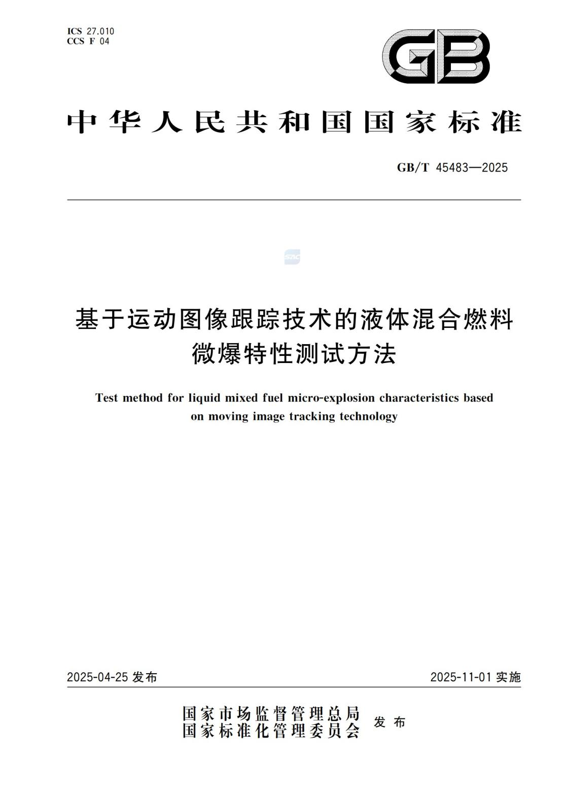 基于运动图像跟踪技术的液体混合燃料微爆特性测试方法国家标准于2023年12月29日经国家标准化管理委员会国家标准委发文批准,全国燃烧节能净化标准化技术委员会(TC441)承担《基于运动图像跟踪技术的液体混合燃料微爆特性测试方法》(中文计划号:20232508-T-469)标准的归口管理和制修订工作。在经历了5次制修订后,该标准于2025年4月25日在全国标准信息公共服务平台发布公告。