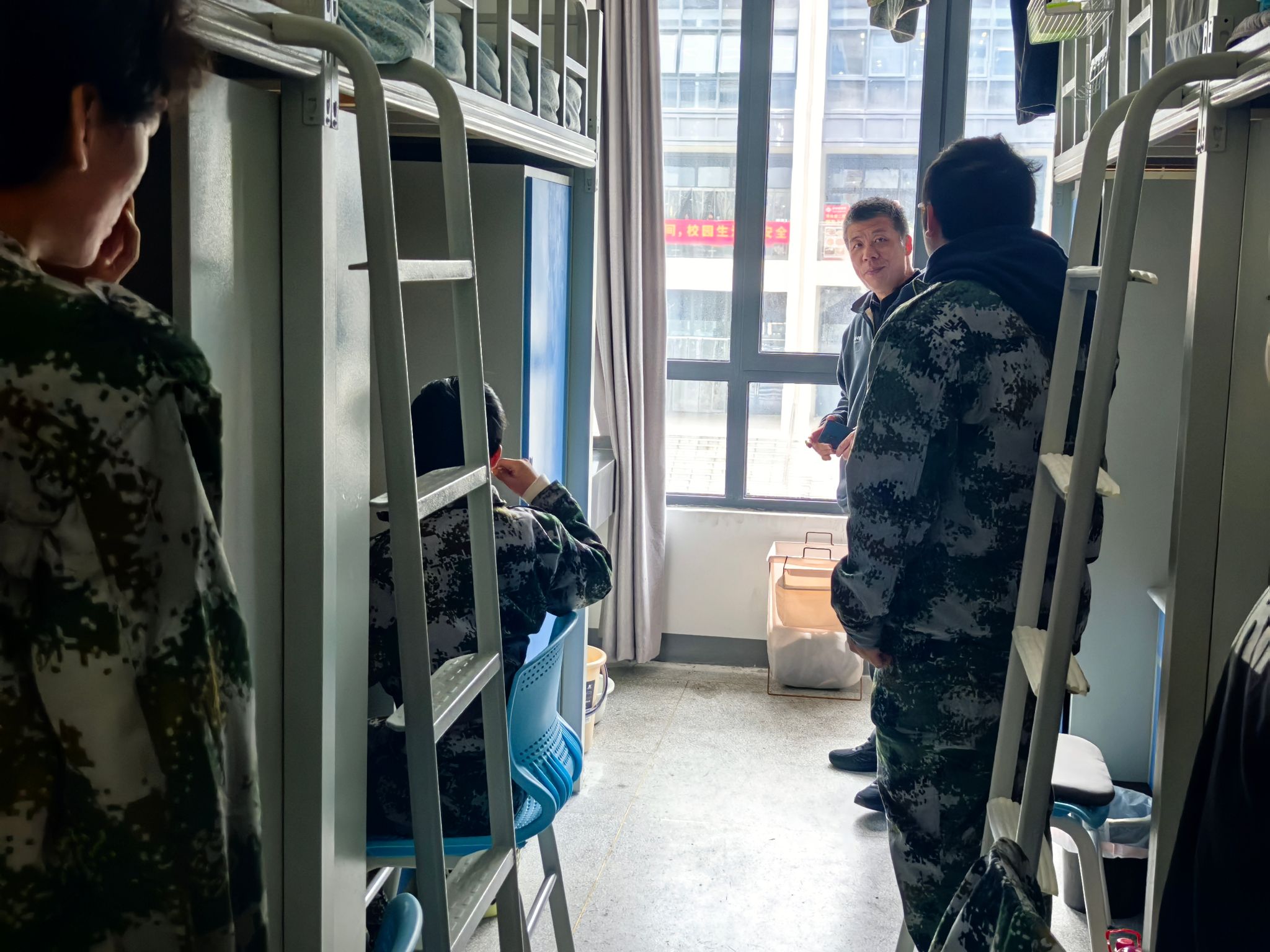 每走进一间新生宿舍,监察组都率先聚焦安全重点,仔细查看宿舍电路接线是否规范、充电插头有没及时拔下,龚桢反复提醒新生,“手机、电脑充电完成后一定要及时拔插头,千万别把插线板放在床品上。” 除了用电安全,他还留意宿舍整体卫生与环境维护, 卫生状况等,叮嘱学生要注意保持好的宿舍卫生环境。安全排查后,龚桢亲切问候学生:“午饭吃没吃?”“食堂饭菜还习惯吗?”“军训强度能不能适应?累不累?....” 轻松的交流间,学生脸上的拘谨渐渐消散,取而代之的是舒展的笑容。