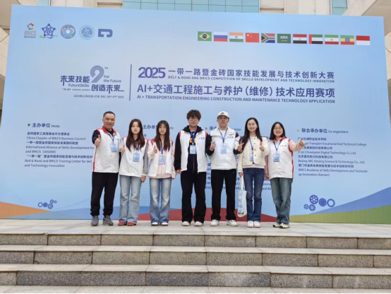 12月4日至7日,2025“一带一路”暨金砖国家技能发展与技术创新大赛之AI+交通工程施工与养护(维修)技术应用赛项全国总决赛在广西南宁成功举办。我校土木建筑学院由叶生、叶枝老师指导的铁路队(24检测2班杨清琳、24检测4班毛乐奕阳)荣获团体一等奖;由杨锐、武余波老师指导的公路队(23路桥4班王超、24路桥1班汪妍)荣获团体三等奖。叶生、叶枝两位老师获评“优秀指导教师”,学校荣获“最佳组织奖”。