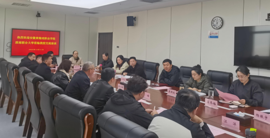 12月11日,安徽黄梅戏艺术职业学院党委副书记、校长陈二祥,党委委员、副校长陈詠等一行13人,淮南联合大学党委委员、副校长黄伟等一行5人莅临我校学习办学能力评价工作经验。我校党委副书记、校长孙晓雷,党委委员、副校长梁洪波出席座谈会,校办公室、教务处、信息化建设与管理中心等相关部门人员参加座谈。