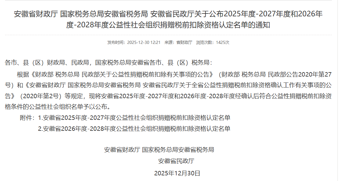 近日,安徽省财政厅、国家税务总局安徽省税务局、安徽省民政厅联合发布《安徽省关于公布2025年度-2027年度和2026年度-2028年度公益性社会组织捐赠税前扣除资格认定名单的通知》。经严格审核与综合评估,安徽交通职业技术学院教育基金会成功入选安徽省2025年度-2027年度公益性社会组织捐赠税前扣除资格认定名单。