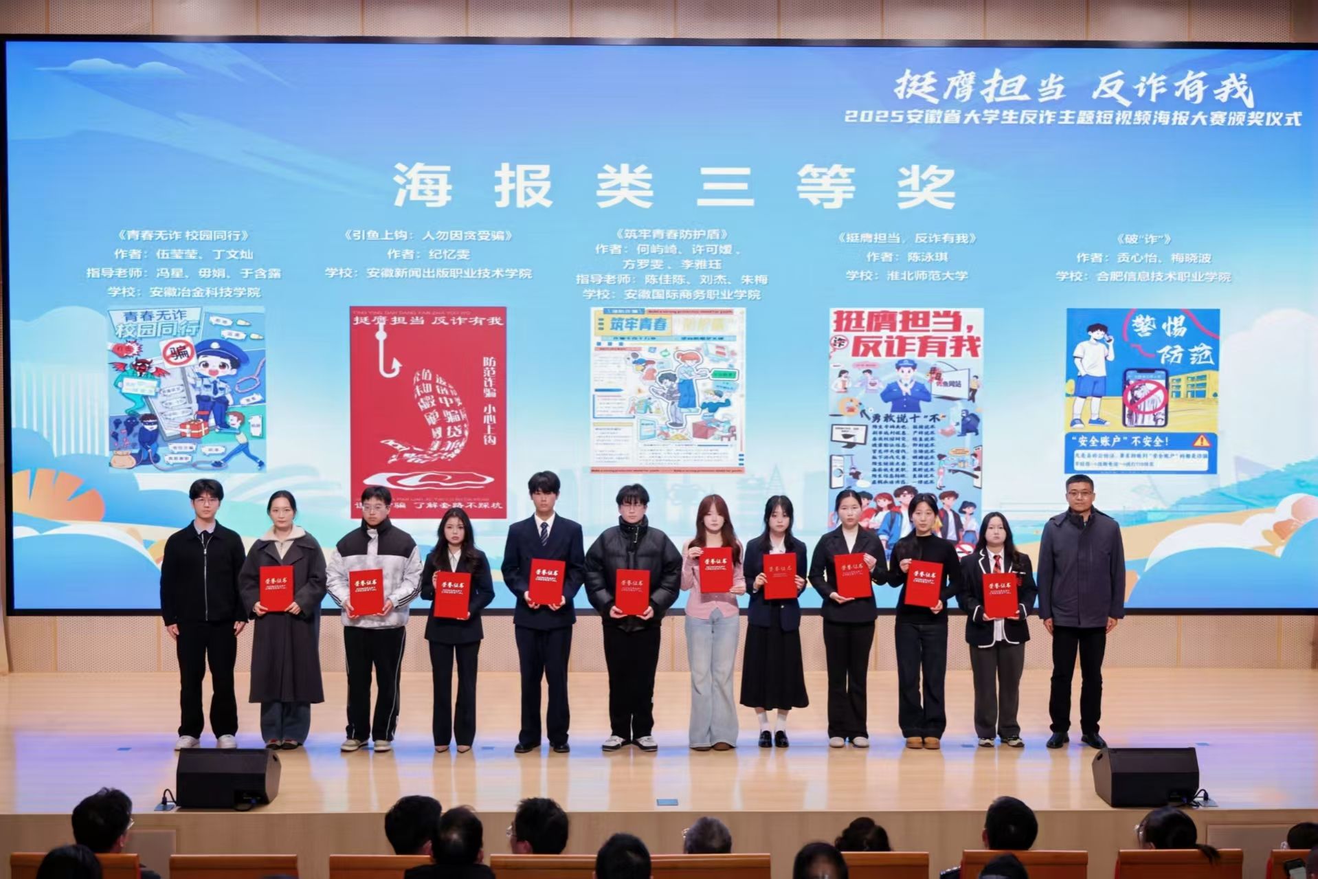 近日,我校郝涵雨、李俊豪、白昕宇3名同学组成的创作团队,在由安徽省通信管理局、安徽省公安厅、安徽省教育厅、共青团安徽省委员会、安徽省学生联合会联合主办的2025年 “安徽省大学生反诈主题短视频海报大赛”中,凭借平面设计作品《这场 “游戏”,你永远赢不了》,以其新颖独特的创意构思、扎实精湛的专业技能、深刻鲜明的反诈内涵,在全省众多参赛作品中脱颖而出,获得海报类三等奖。
