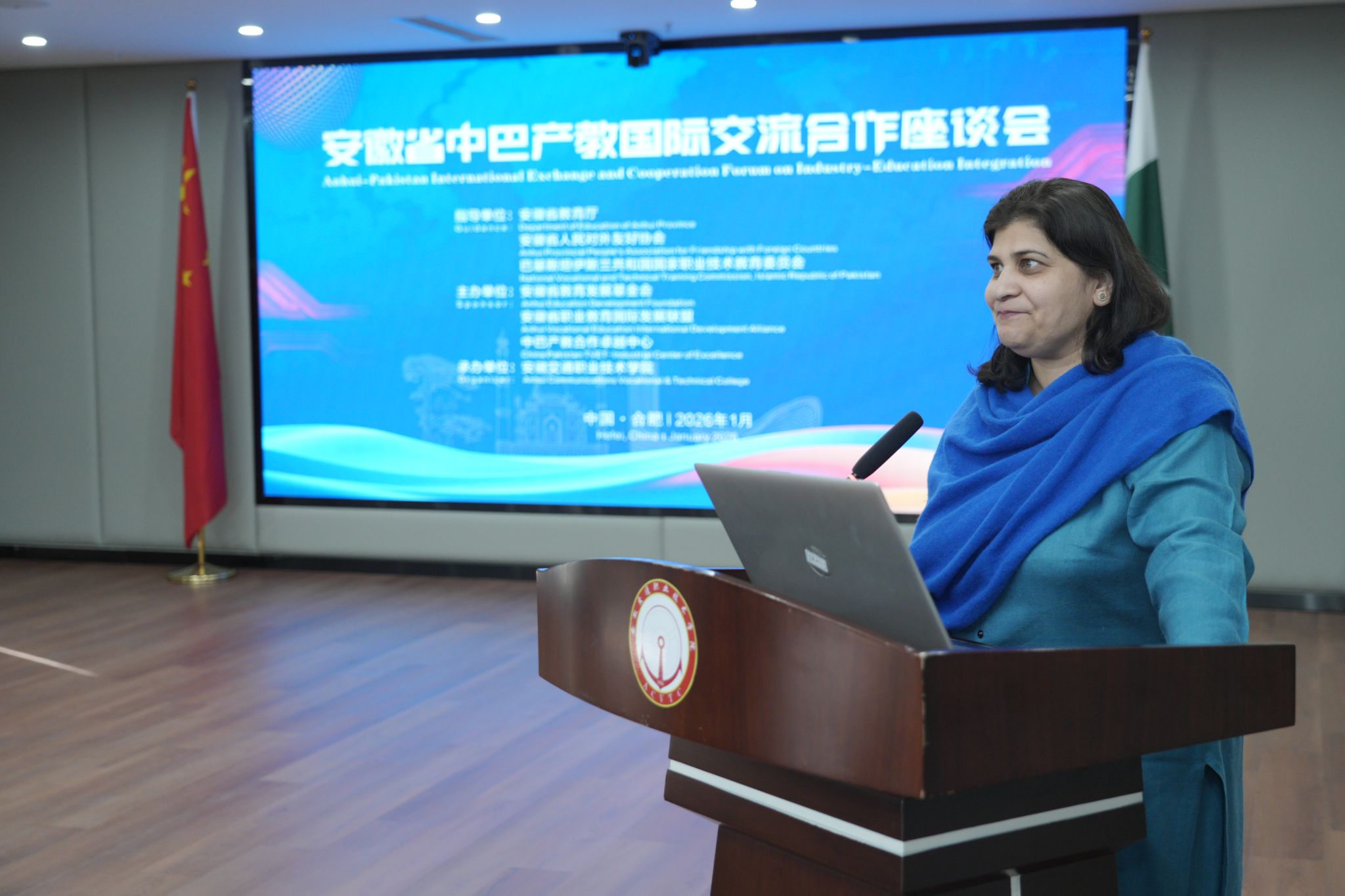 下午的专题座谈会由安徽省职业教育国际发展联盟秘书长、安徽国际商务职业学院党委委员、副校长凌双英主持。孙晓雷在致辞中回顾了学校办学历史与服务交通产业的实践,强调中巴传统友谊是双方合作的重要基础,学校愿充分发挥专业优势,助力巴基斯坦技能人才培养。古尔米娜·比拉尔主席介绍了巴基斯坦职业教育发展现状与愿景,高度评价中巴职教合作前景,期待通过此次交流推动巴基斯坦技术教育升级。