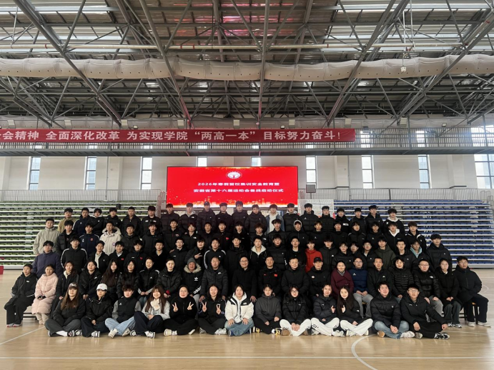 1月18日,学校举行2026年寒假留校集训运动员安全教育暨安徽省第十六届运动会高校部比赛备战启动仪式。副校长汤峰出席并讲话,会议对寒假集训安全管理与省运会备战工作作出再动员、再部署。