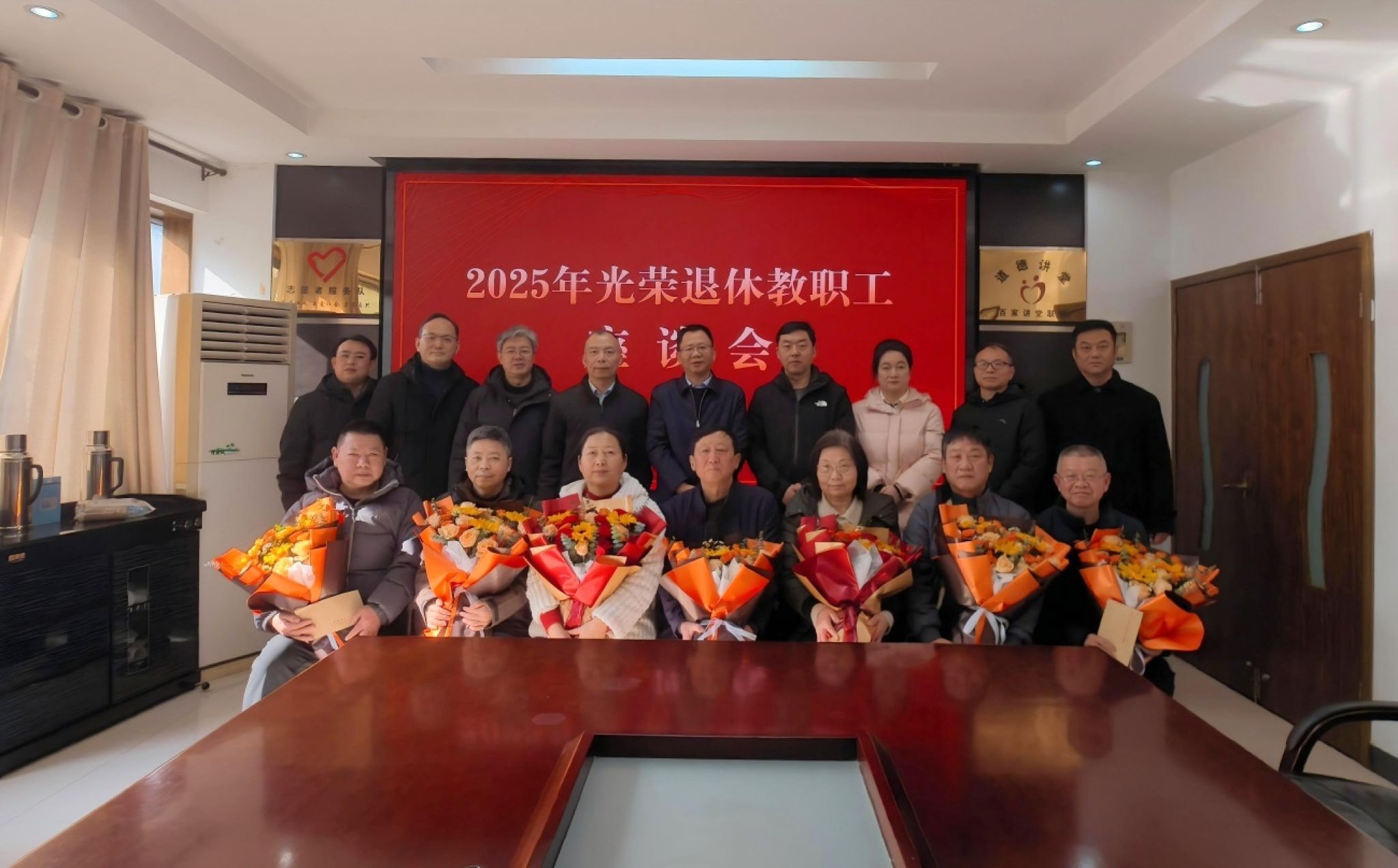 会后,年轻干部代表向退休老同志们献上鲜花,全体人员合影留念。(组织人事处 马涛)