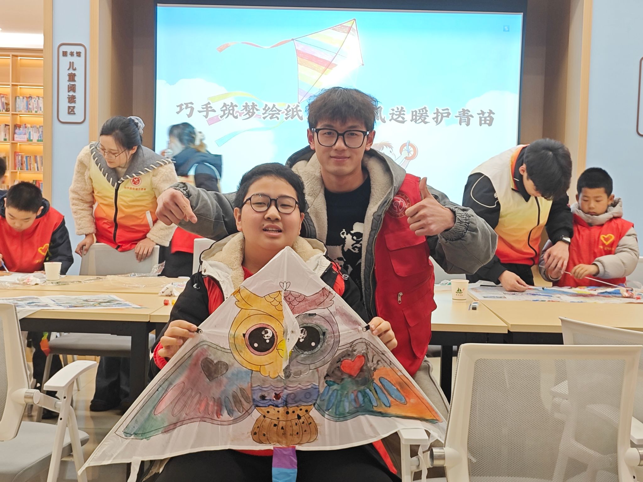 活动现场,志愿者们与社区的孩子们围坐在一起,共同开启手绘风筝的趣味之旅。从调配色彩到勾勒上色,从耐心指导到携手创作,志愿者们手把手带着孩子们在空白的风筝上绘制灵动的猫头鹰、活泼的独角兽……每一抹色彩都传递着陪伴与关爱。此句无错误。在完成手绘创作后,志愿者们细心清洁桌面,整理活动场地,用细致行动践行雷锋精神。活动尾声,孩子们高举亲手绘制的风筝,与志愿者们合影留念,脸上洋溢着自豪与喜悦。
