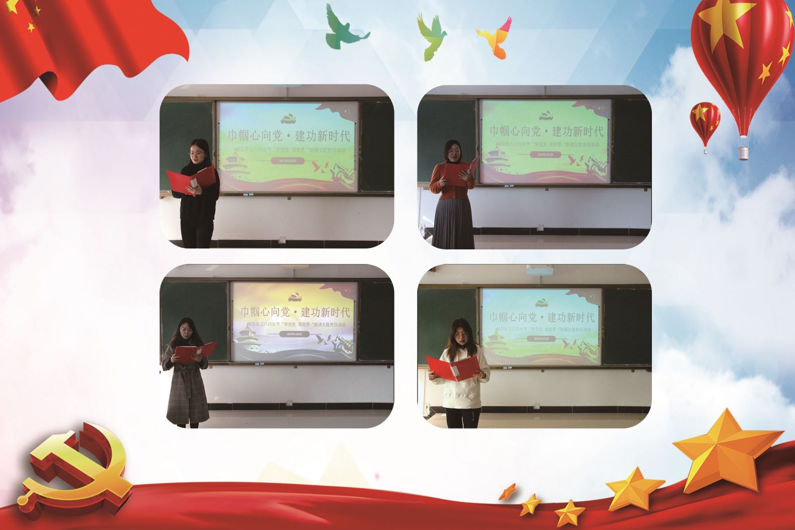 3月4日下午,为深入学习贯彻习近平新时代中国特色社会主义思想,深入开展党史学习教育,在“三八”国际劳动妇女节到来之际,城信系举办“学党史·颂党恩”朗诵主题党日活动暨手工体验活动,系全体女教职工参加。