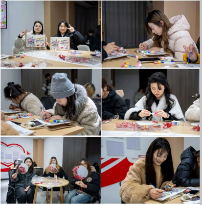 活动现场暖意融融,轻柔的音乐与同学们的欢声笑语交织。在老师的指导下,同学们巧手翻飞,创意无限:素色团扇上,干花错落有致,玫瑰的热烈与满天星的清雅相映成趣,将春日的浪漫凝于方寸之间;纯白帆布包上,画笔勾勒出可爱的卡通形象,或写下“做自己的光”等励志话语,让个性宣言与美好期许尽情绽放。创作过程中,大家相互协作、分享灵感,在指尖流转间不仅收获了独一无二的作品,更增进了友谊与成就感。