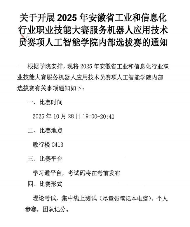 关于开展2025年安徽省工业和信息化行业职业技能大赛服务机器人应用技术员赛项人工智能学院内部选拔赛的通知