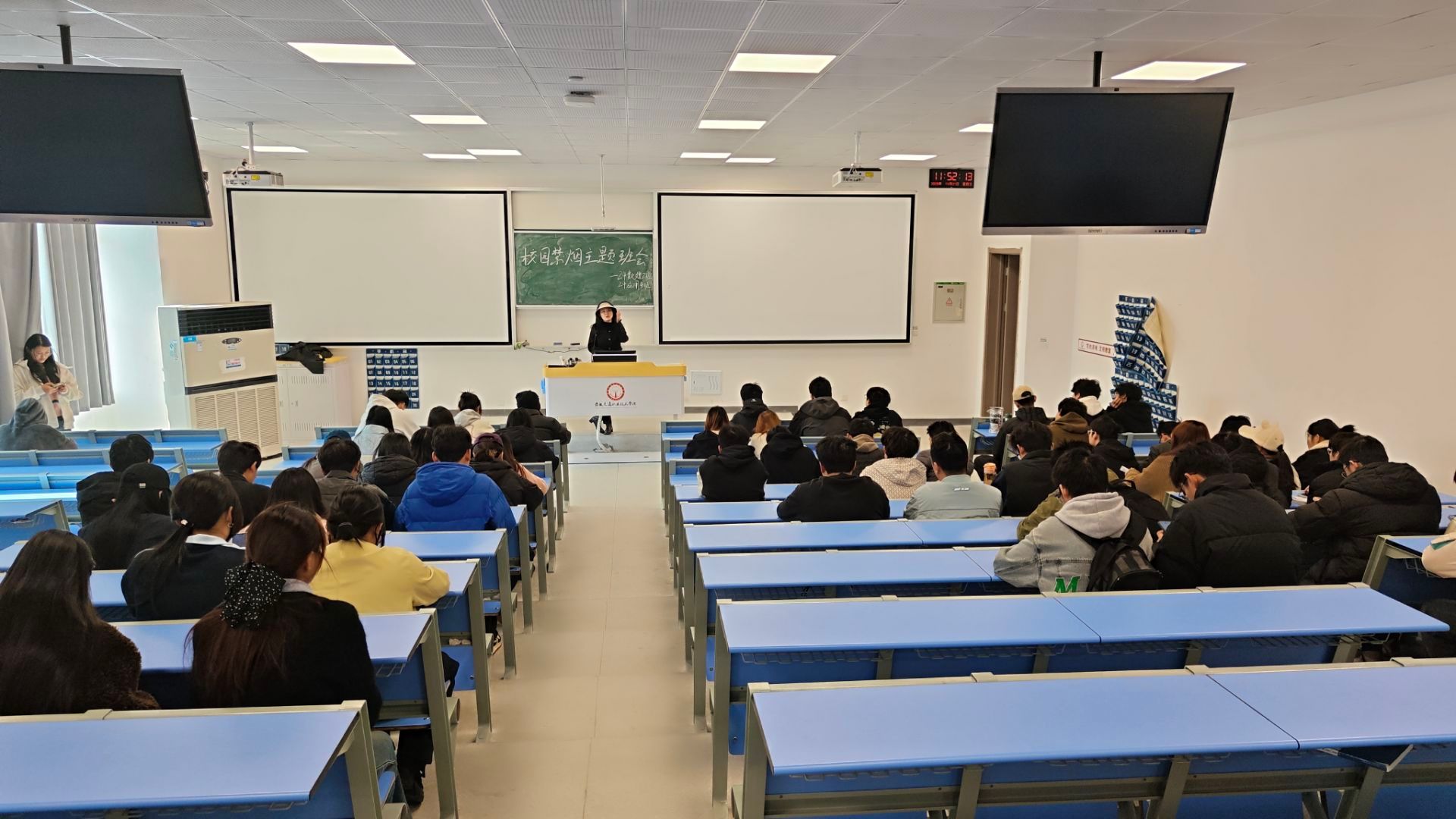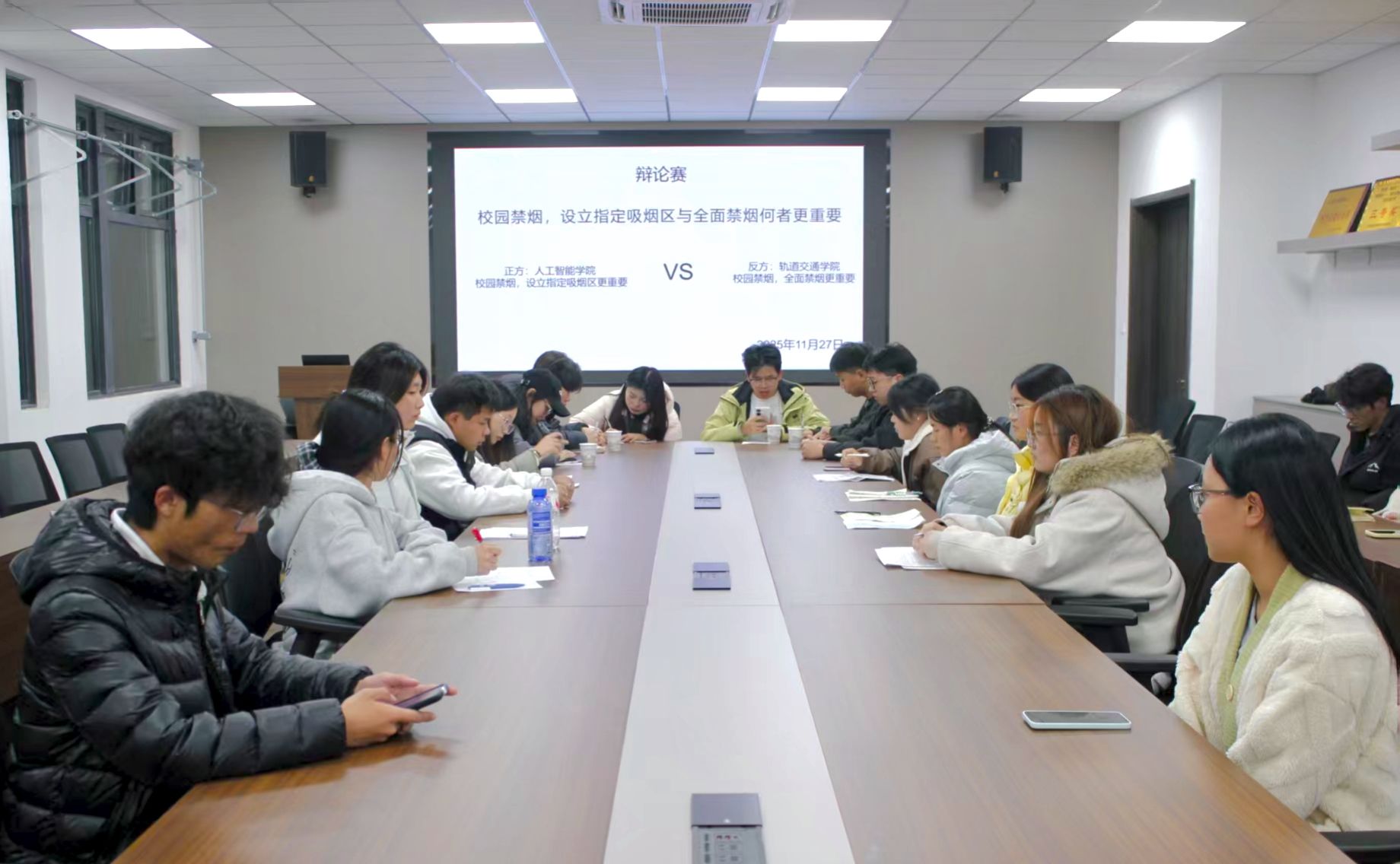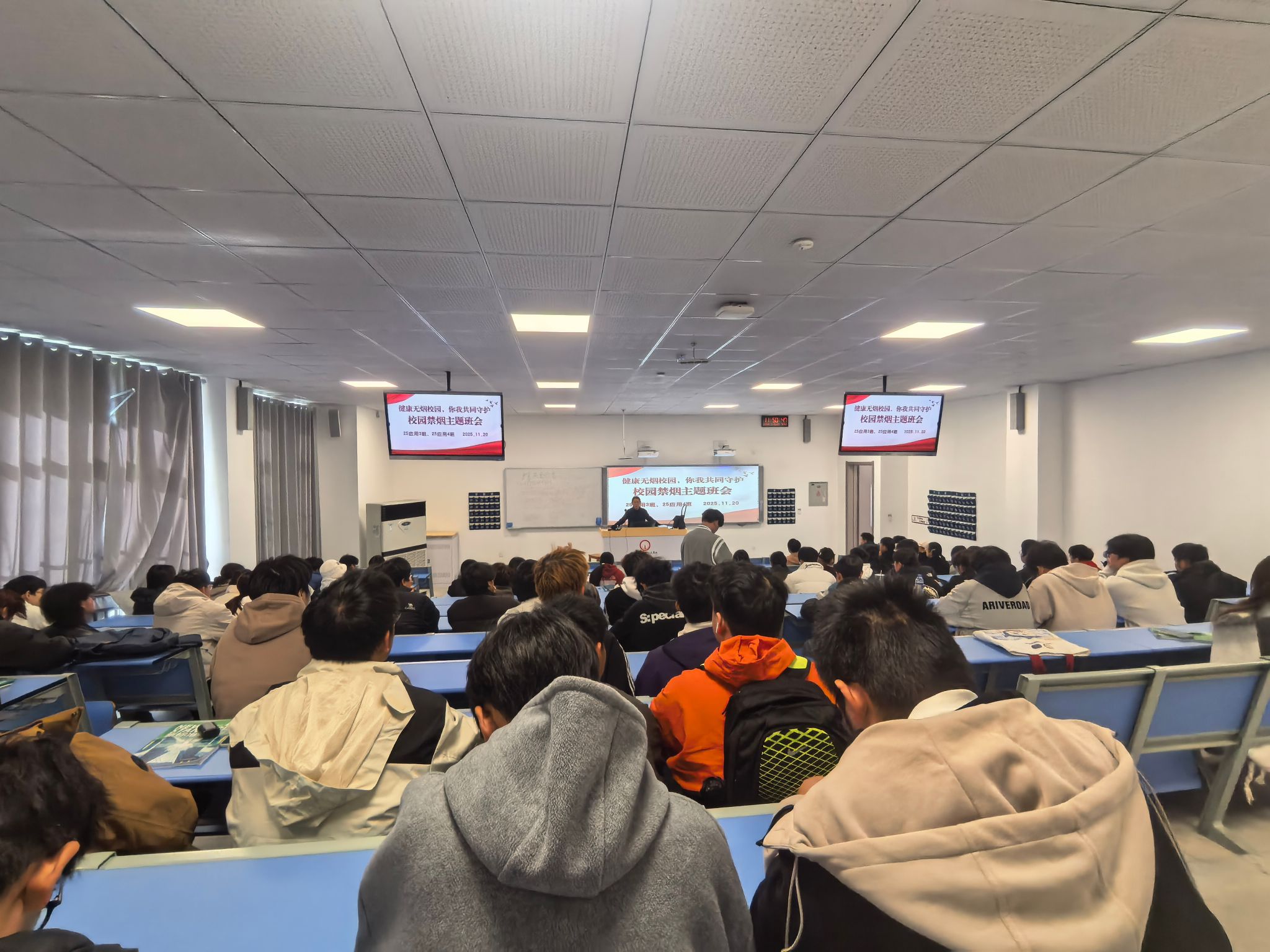 多元宣传、警示教育。各班级先后通过主题班会、案例剖析、政策宣讲等形式,系统讲解禁烟政策依据、违规处理标准等内容,引导学生树立“不吸烟、拒吸二手烟”的文明理念,强化学生安全意识与纪律意识。学院同步组织“校园禁烟,设立指定吸烟区与全面禁烟何者更重要”主题辩论赛,让学生在思辨中深化对禁烟意义的理解,营造“人人参与禁烟、共建文明校园”的良好氛围。