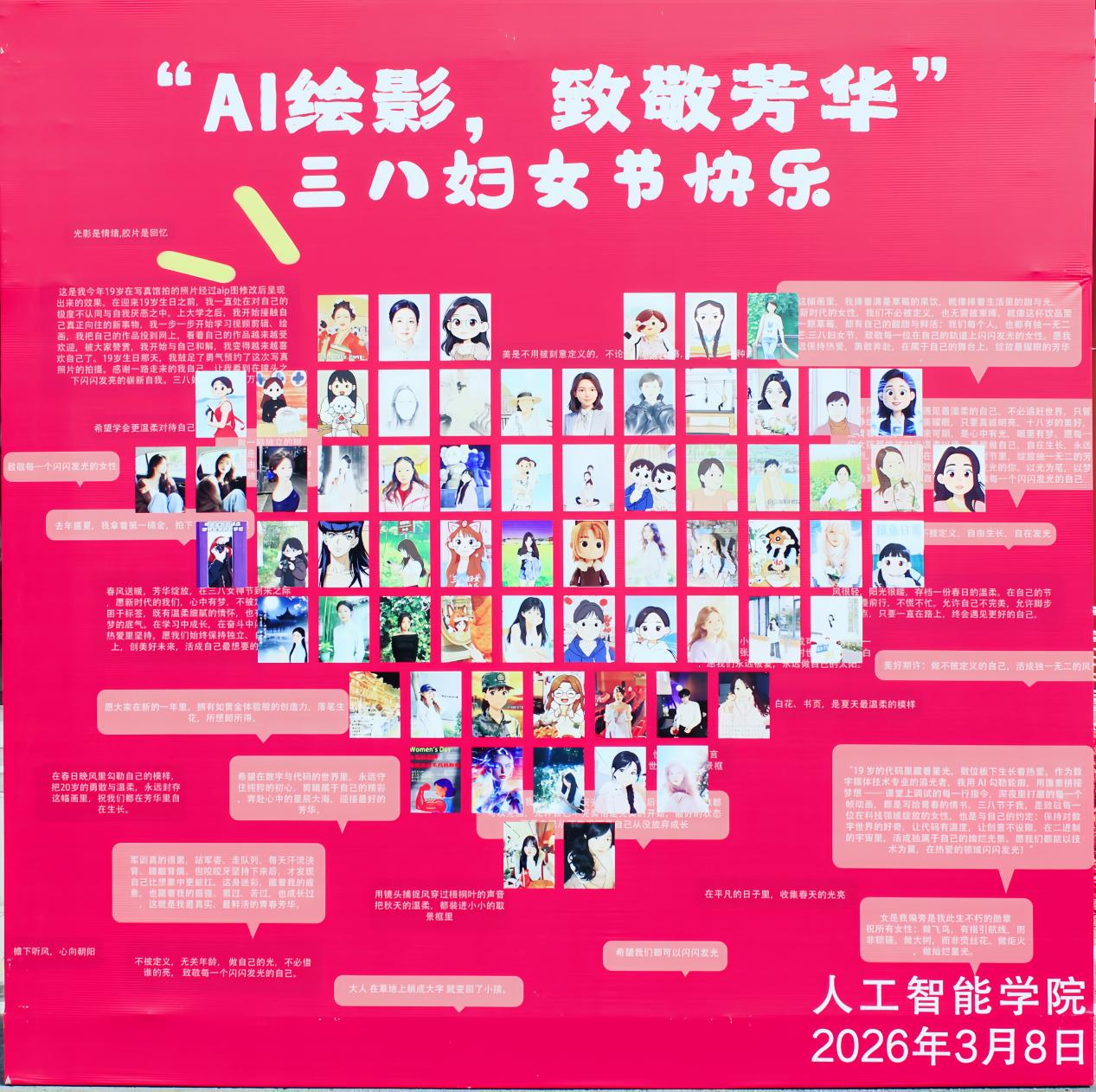春暖三月,芳华绽放。为庆祝国际三八妇女节,充分展现学院女生的独特魅力与精神风貌,用科技与艺术的融合致敬女性力量,我院成功举办 “AI 绘影,致敬芳华” 主题活动。全院师生积极响应,以AI为笔,以时光为墨,绘就专属青春画像,共赴这场美好之约。