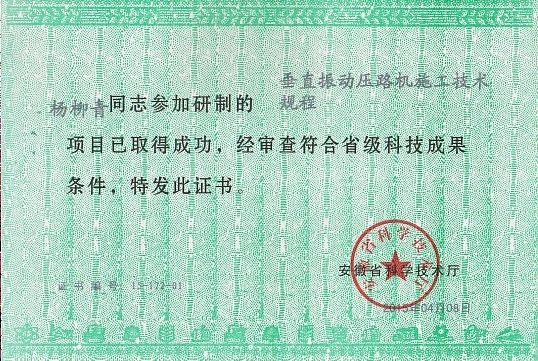 该项目于2011年8月正式立项,2014年8月正式完成,经安徽省质量技术监督局批准于2014年9月28日正式发布安徽省地方标准《垂直振动压路机施工技术规程》(DB34/T 2152—2014),行业主管部门安徽省交通运输厅于2014年10月19日在合肥宣贯。