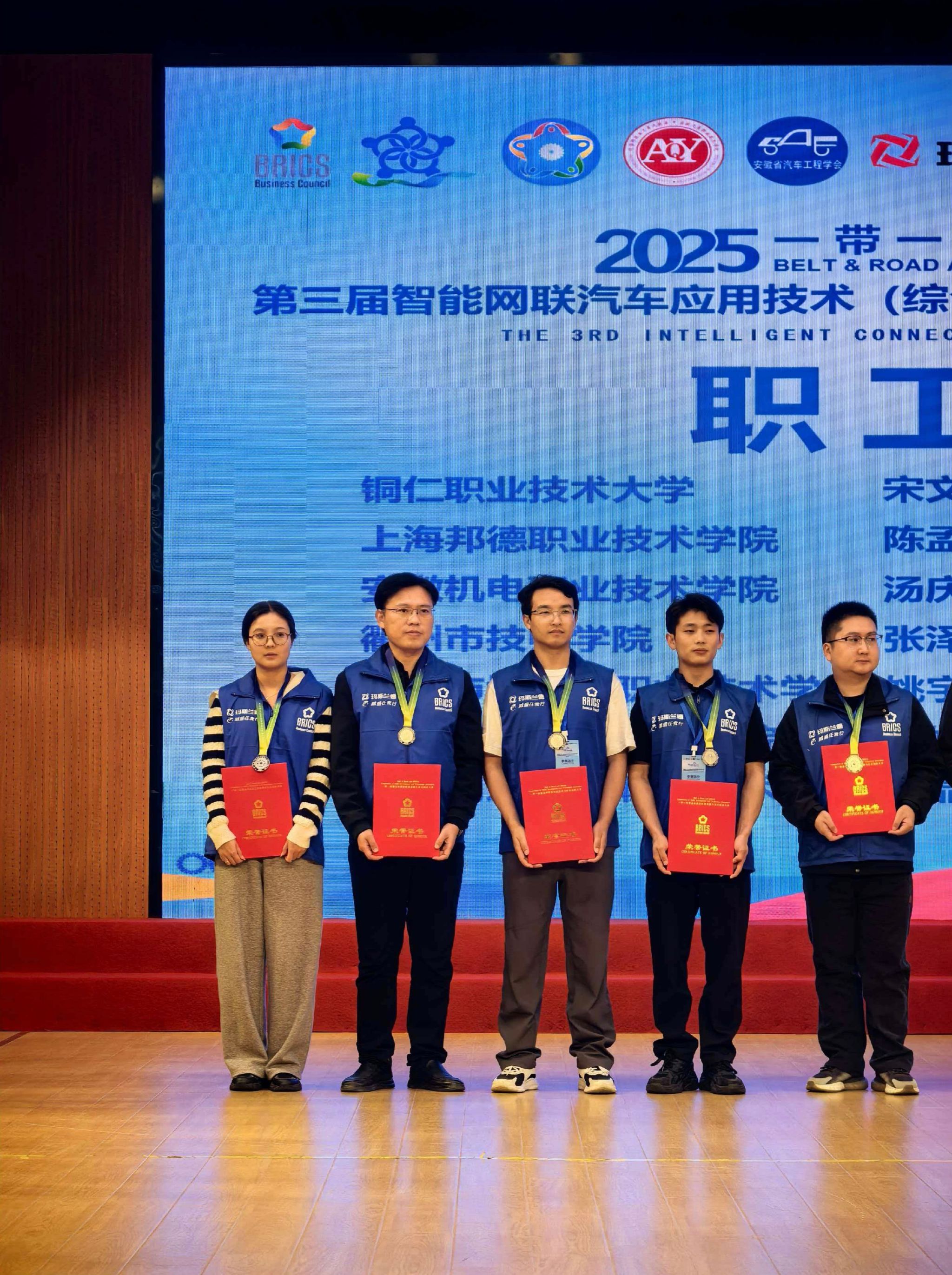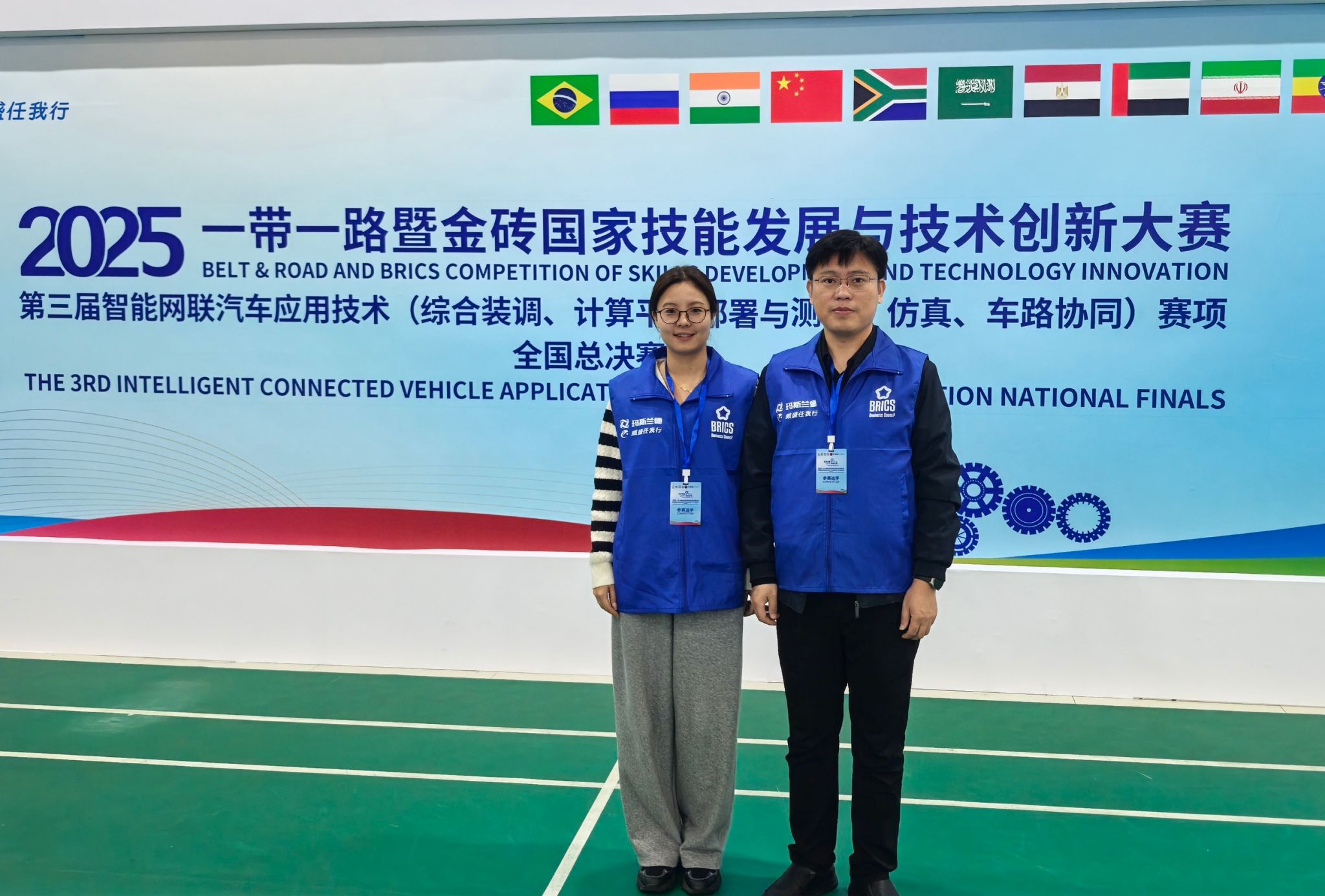 11月7日至9日,2025一带一路暨金砖国家技能发展与技术创新大赛第三届智能网联汽车应用技术(综合装调、计算平台部署与测试、仿真、车路协同)赛项全国总决赛在安徽汽车职业技术学院举办。来自全国中职、高校、企业的290个代表队580名选手在三天内展开技能对决。我院相象文、蔡娟娟教师团队获总决赛职工组二等奖。
