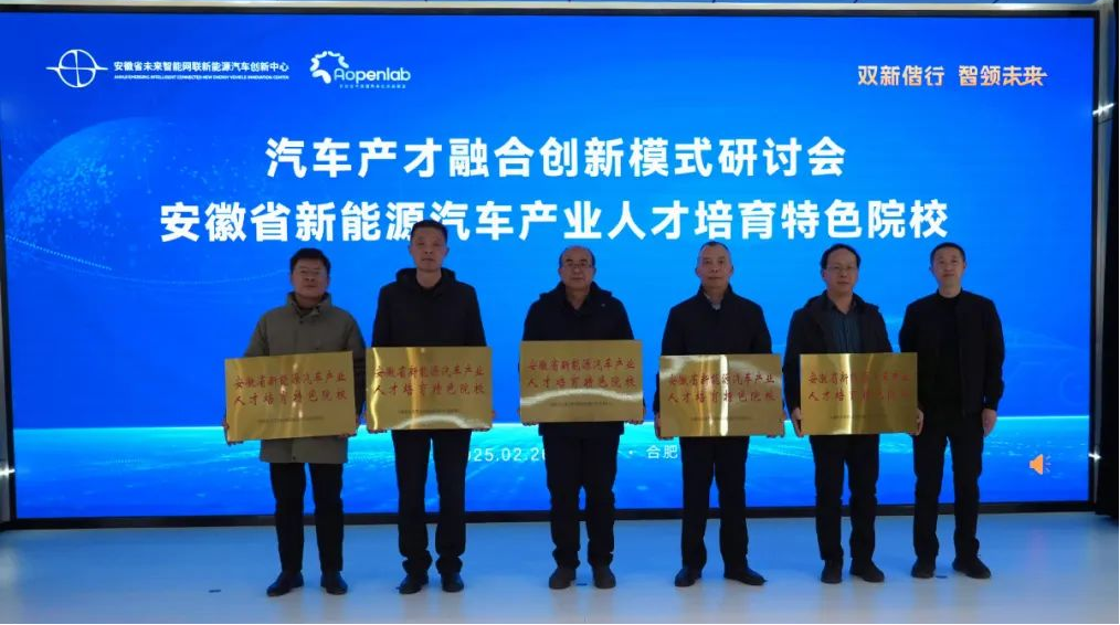 会上,受省发展改革委、省教育厅、省人力资源社会保障厅委托,安徽省未来智能网联新能源汽车创新中心正式发布《安徽省新能源汽车产业人才培育十佳院校》和《安徽省新能源汽车产业人才培育特色院校》,韦兵登台接牌。
