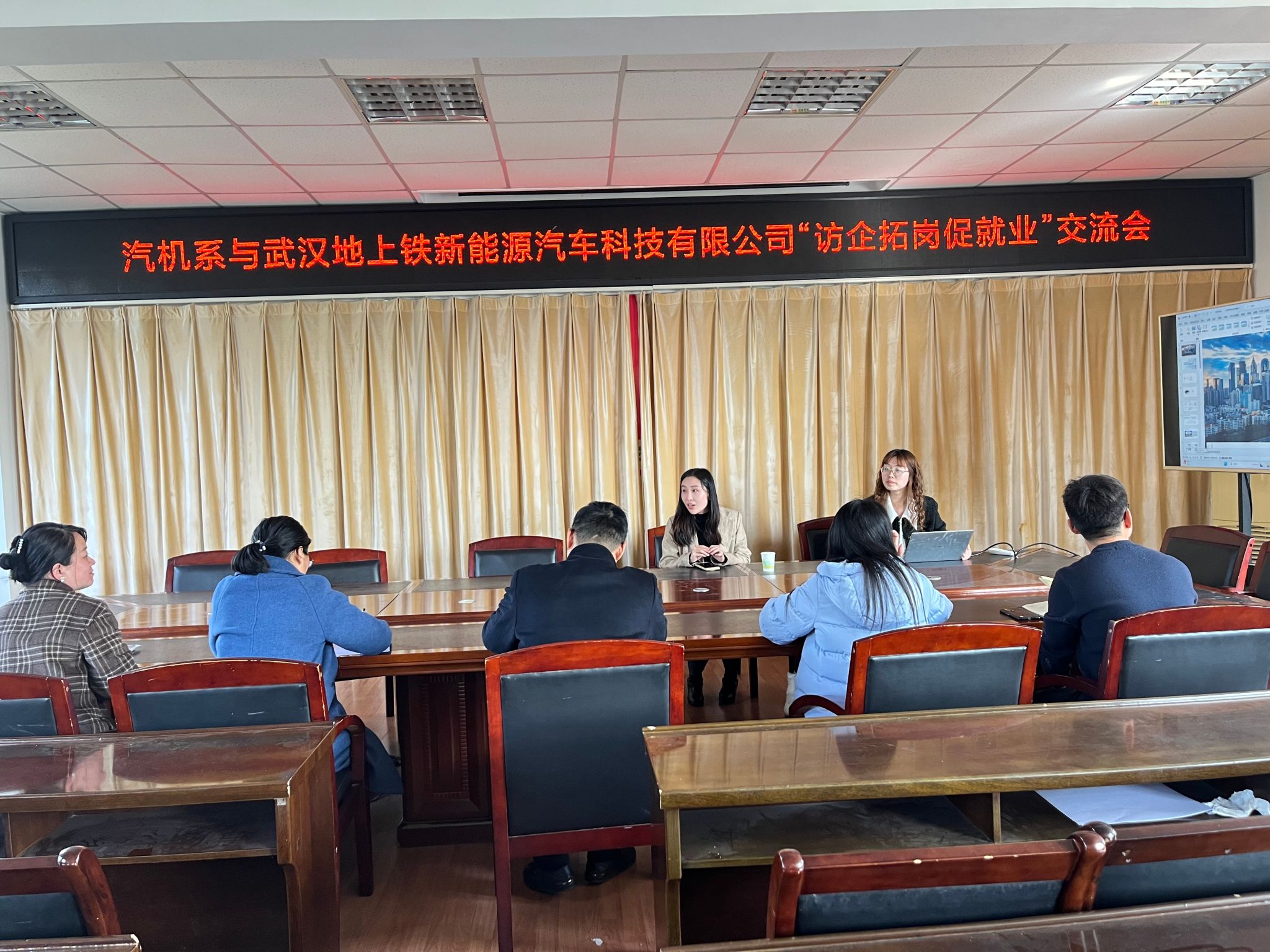 为进一步加强校企合作,促进产教融合,拓宽毕业生就业渠道,3月21日我系与武汉地上铁新能源汽车科技有限公司开展访企拓岗交流会。汽车与机械工程系总支书记沈劲松、副书记汪莉、主任辅导员罗玮玮、就业负责老师王莹、李成成,武汉地上铁新能源汽车科技有限公司人力资源黄莹、胡娇等参加了此次交流会。