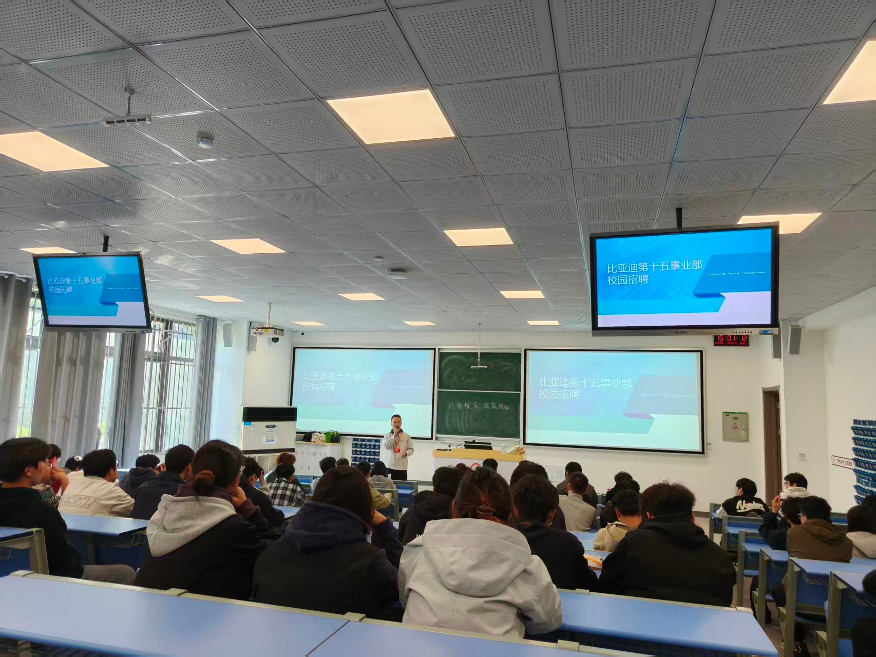 近日,比亚迪第十五事业部校园招聘宣讲会走进我院,吸引了23、24 级学生参与,25 级新生也主动到场 “围观”,各年级学子共同解锁企业就业 “提前批” 信息。