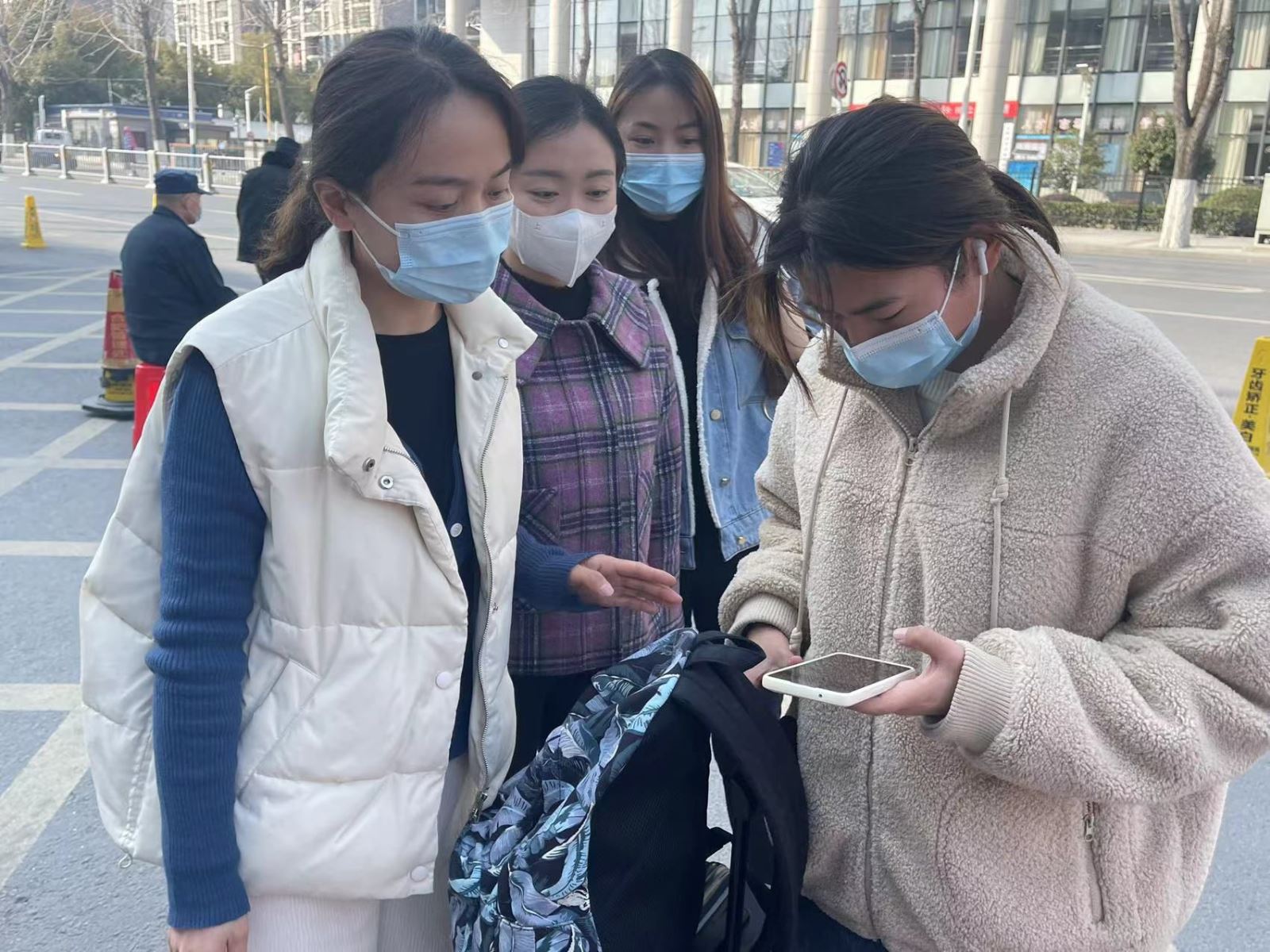 2月26日-27日期间,学生返校期间,蒋凤娇与张瑶、宣荣荣老师在学院北门核查疫情防控返校情况,检查学生48小时内核酸检测阴性证明、健康码(含疫苗接种证明)和行程卡“绿码”。