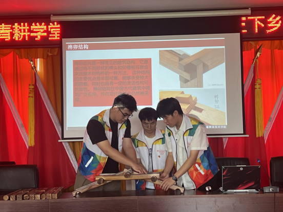 第二堂课上,道路与桥梁工程技术专业的学生代表“刺猬哥哥”以“小小桥梁工程师——神奇的榫卯结构”为题,结合土木工程系专业特色,讲解常见的几种桥梁基本结构,现场搭建传统榫卯结构桥梁并解释原理,邀请孩子们爬上桥梁测试牢固度并尝试搭建,指导学生用折纸搭桥小实验感受“力学”的美妙,点亮“专业”梦想。