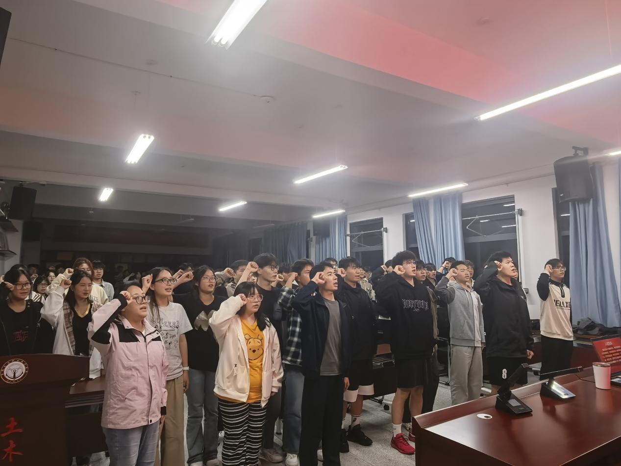 团课最后,在庄严肃穆的氛围中,来自学生党支部的学生党员冀董洋带领全体与会人员,面向党旗,领读入党誓词。铿锵有力的誓言,表达了土木青年坚定不移跟党走、为共产主义事业奋斗终身的坚定决心。