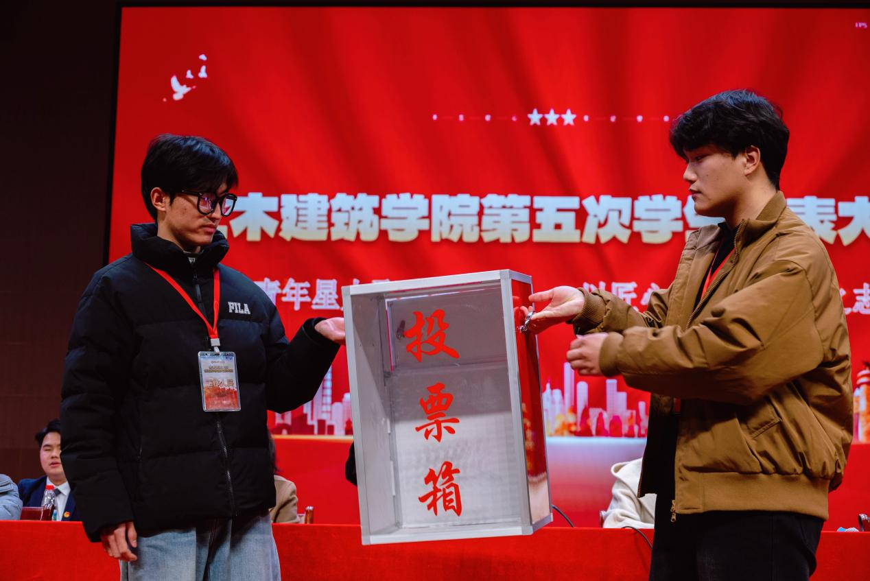 12月11日,土木建筑学院第五次学生代表大会在经世大礼堂胜利召开。学院党总支书记邵登泰、党总支副书记王佳宾、学生管理老师以及学生代表齐聚一堂,共商团学事业发展,汇聚青春智慧与奋进力量。