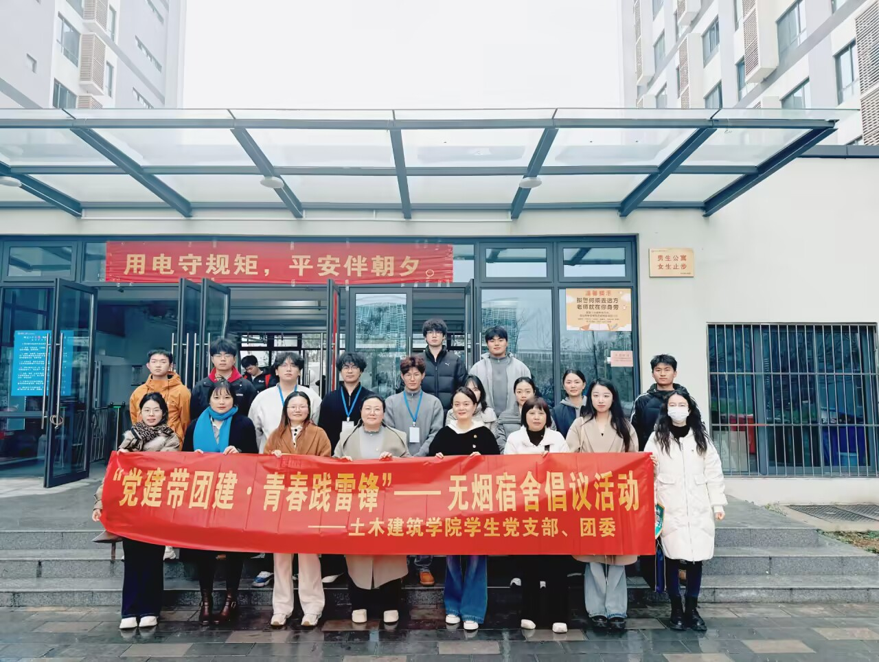 为深入贯彻新时代校园文明建设要求,弘扬雷锋精神,强化学生宿舍安全与健康管理,土木建筑学院学生党支部联合团委于3月18日开展“党建带团建·青春践雷锋”无烟宿舍倡议活动。学院党总支副书记王佳宾、学生党支部教师党员和学生党员、团员志愿者共同参与,以宿舍为切入点,通过实际行动践行“无烟校园”的理念。