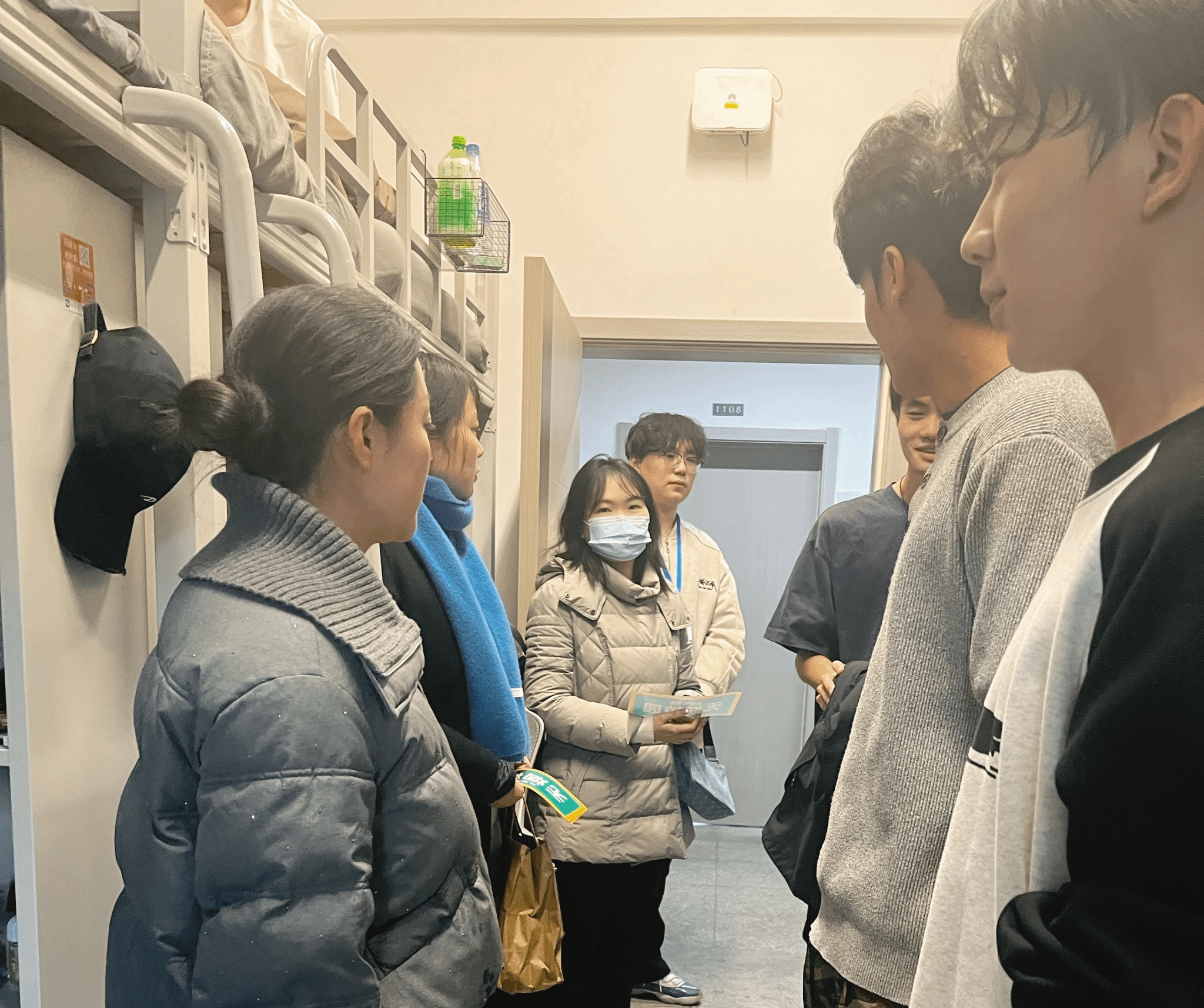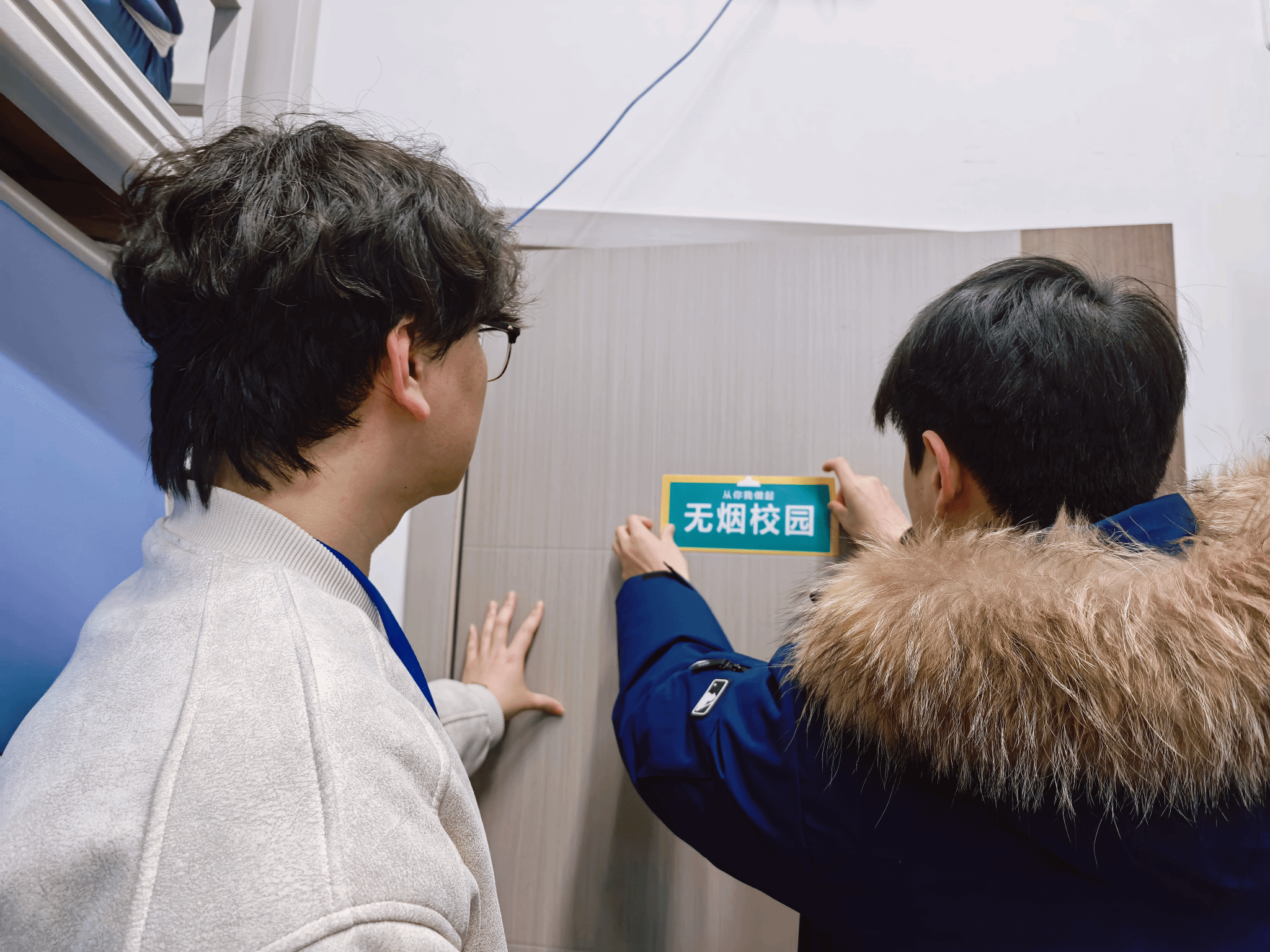在走访过程中,师生们还同步开展“标识上墙”行动——学生党员与志愿者协作,在重点宿舍的门上、墙面显眼处张贴“无烟校园”主题标识牌。这些标识如同“无声的监督员”,时刻提醒同学们守护无烟环境、严守用电安全,让文明规范从“口头倡议”转化为“空间约束”,为宿舍文明建设注入长效机制。